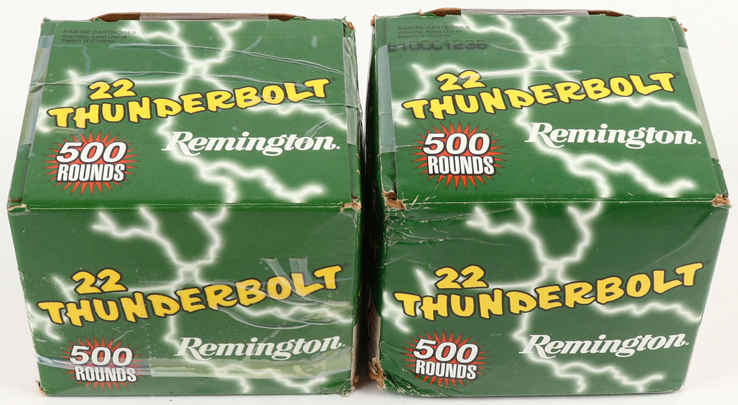 Remington, Lot of (2), Thunderbolt, .22 Long Rifle, High Velocity, Round Nose, both boxes FULL & SEALED, 500rds. (1,000rds. Total) 1pc. Green yellow & white bulk boxes, boxes are both covered in tape, some edge & corner wear. Grade: Very Good ++ - Value: 20 to 80