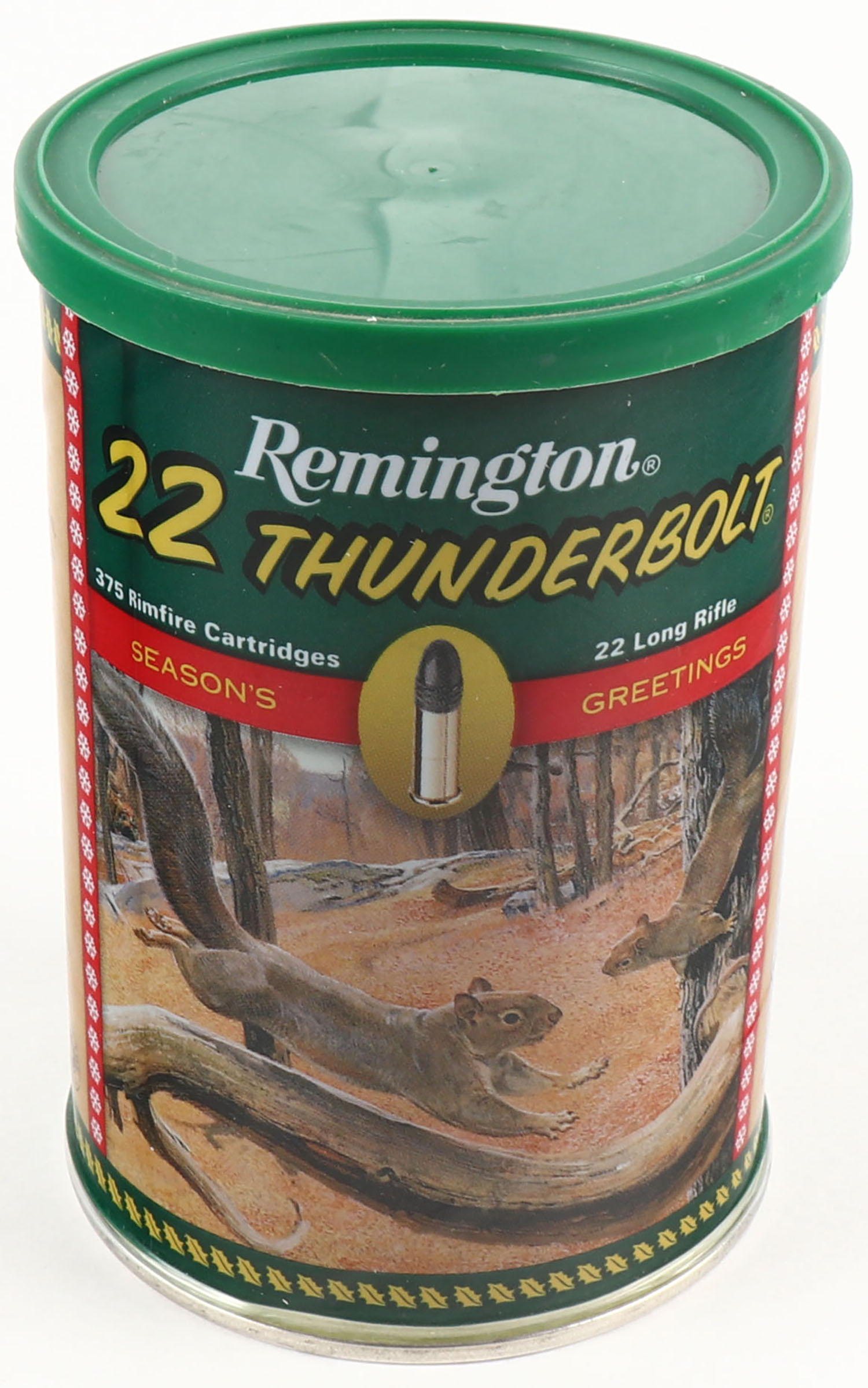 Remington, 22 Thunderbolt, .22 Long Rifle, High Velocity, Seasons Greetings, FULL & SEALED, 375rds. 2pc. Multicolored holiday tin features squirrels in a tree with a festive holiday border, tin is MINT with minty color, bottom is clean and shiny, label is intact. Grade: MINT - Value: 50 to 150