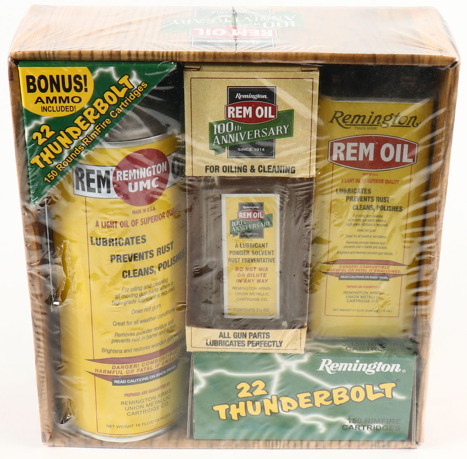 Remington, 100th Anniversary Rem Oil/Thunderbolt Promotional Box, .22 Long Rifle, FULL & SEALED, 150rds., oil can, oil tin, oil bottle, sealing plastic has a small puncture on front. Grade: Excellent ++ - Value: 20 to 60