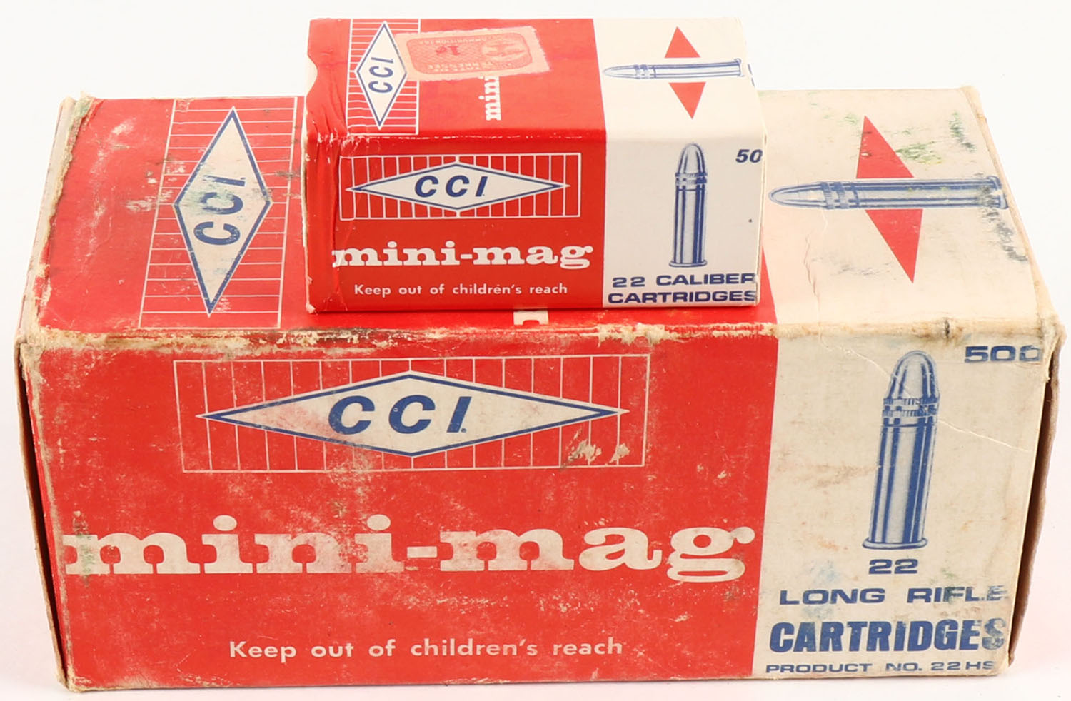 CCi, mini-mag, .22 Long Rifle, Full, 500rds., 1pc. Red white & blue brick, brick is solid with good color, age soiling, shelf wear, some edge & corner wear, end flaps are solid, inside boxes are minty. Grade: Very Good - Value: 30 to 90