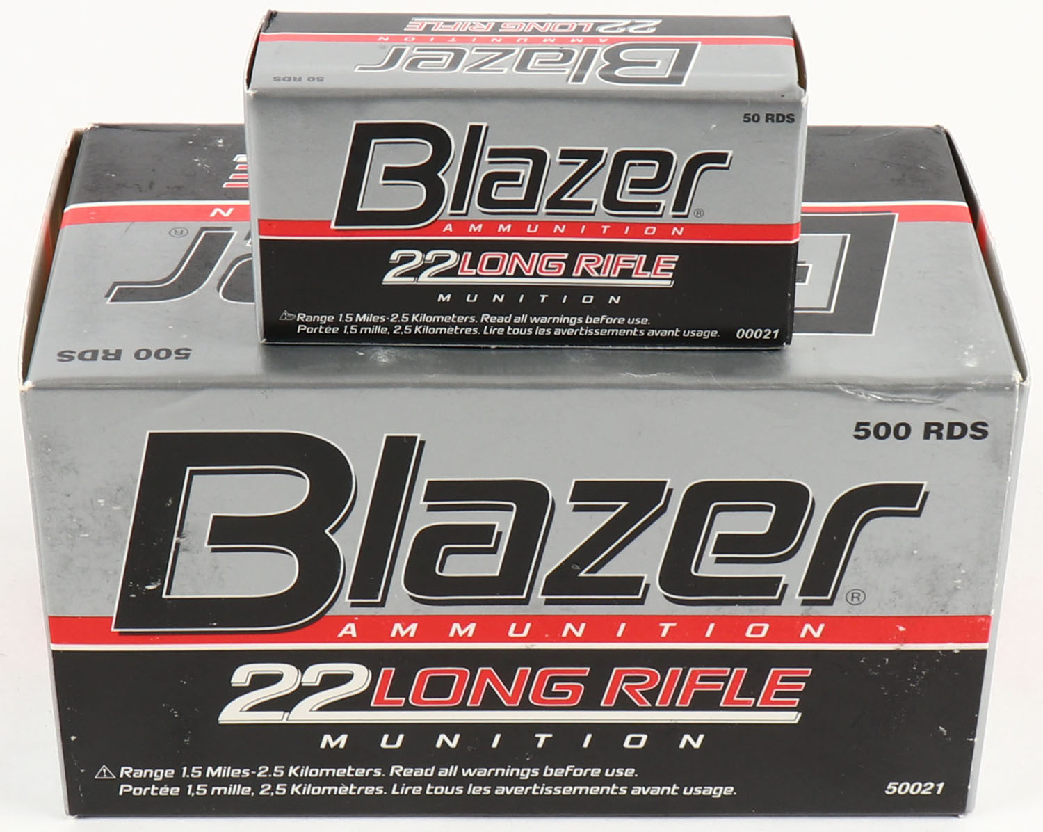 CCi, Blazer, .22 Long Rifle, Full, 500rds., 1pc. Silver black & red brick, brick is solid with excellent to minty color, very minor shelf & corner wear, edges are crisp, end flaps are solid, inside boxes are mint. Grade: Excellent + - Value: 20 to 60
