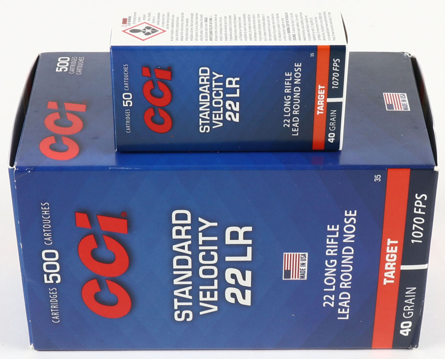 CCi, Standard Velocity, .22 Long Rifle, 40 Grain Lead Round Nose, 1070 FPS, Full 500rds., 1pc. Blue red & white brick, brick is MINT with mint color, corners are mostly sharp, edges are crisp, end flaps are solid, inside boxes are mint. Grade: MINT - Value: 20 to 60