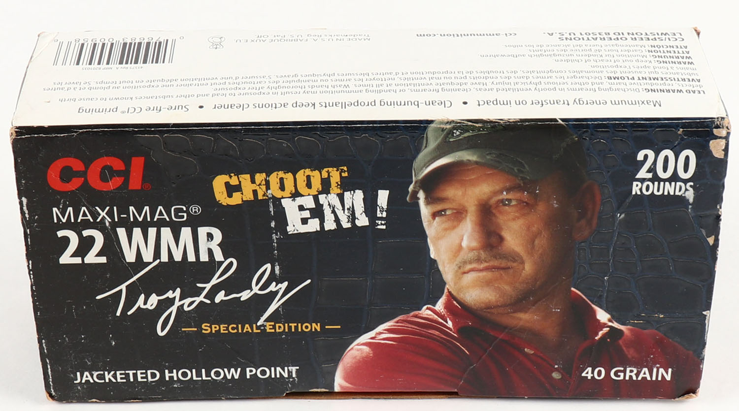 CCi, Choot Em! Troy Landry Special Edition, .22 WMR Hollow Point, Maxi-Mag, Full, 200rds. 1pc. Blue bulk box featuring Troy Landry, box is solid with excellent color, some shelf & corner wear, very minor edge wear, end flaps are solid, ammo is minty. Grade: Excellent - Value: 30 to 90