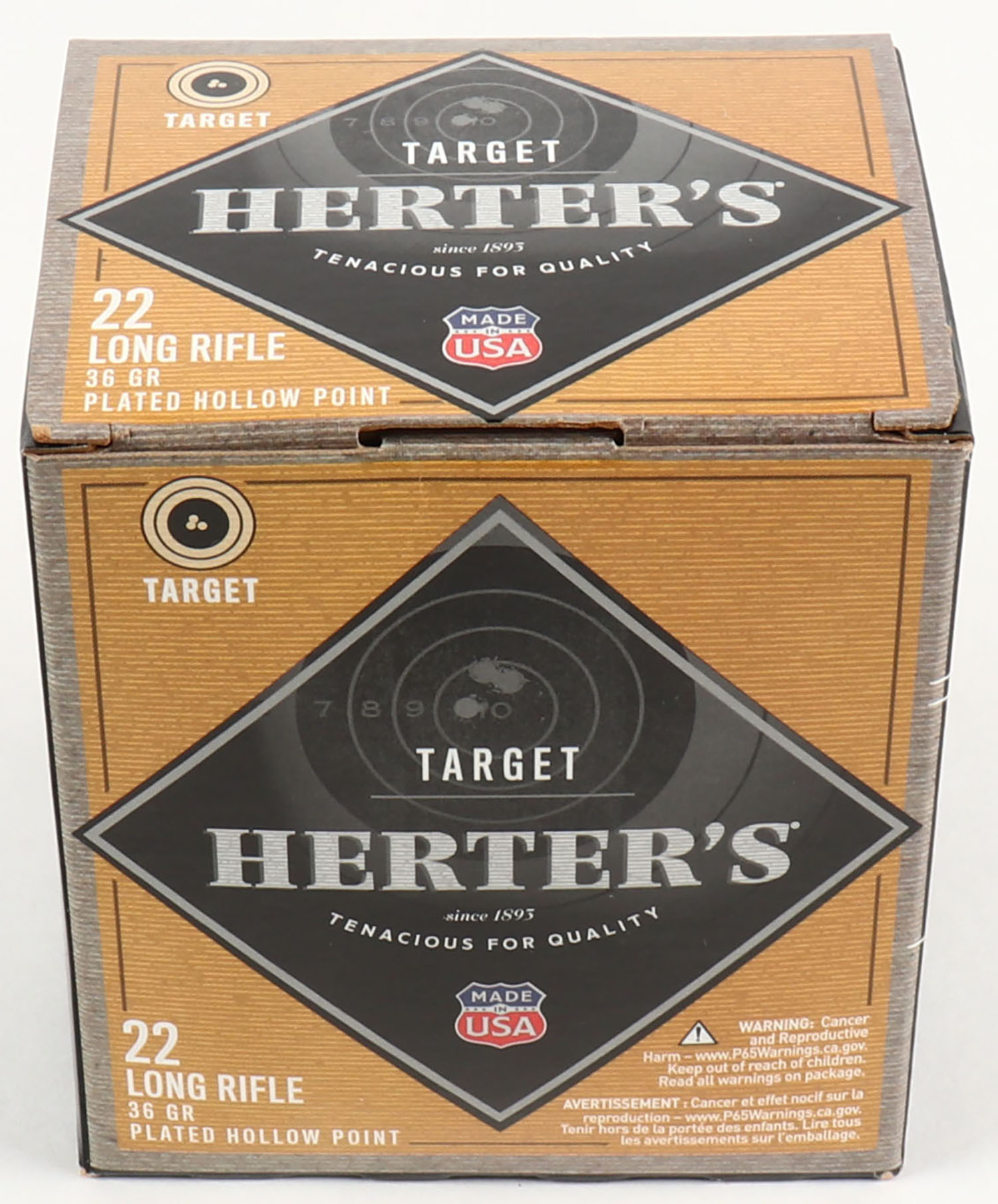 Herters, Target, .22 Long Rifle, 36 Grain Plated Hollow Point, Full, 500rds., 1pc. Brown & black bulk box, box is MINT with minty color, corners are sharp, edges are crisp, top flap is solid, ammo is excellent to minty. Grade: MINT - Value: 16 to 60