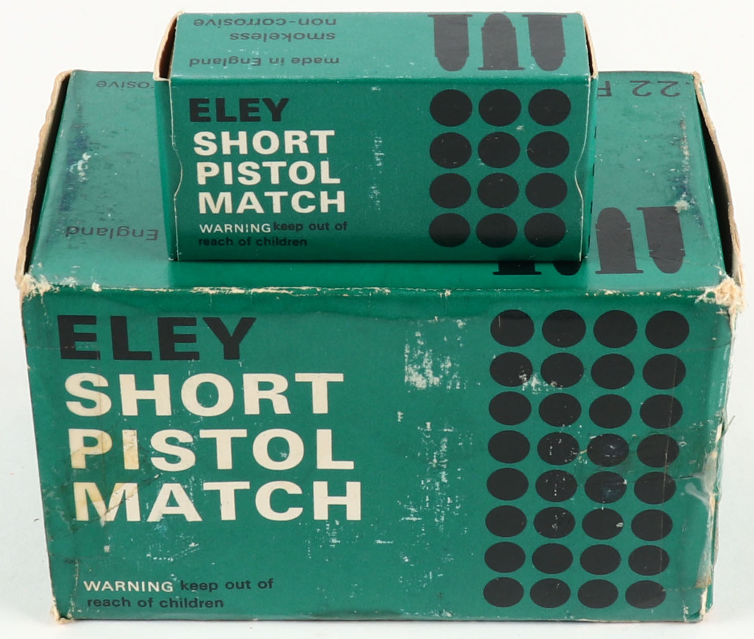 Eley, Short Pistol Match, .22 Short, Full, 500rds., 1pc. Green black & white brick, brick is solid with very good to excellent color, some shelf wear, some edge & corner wear, tape on both ends, end flaps are solid, inside boxes are minty. Grade: Excellent - Value: 40 to 120