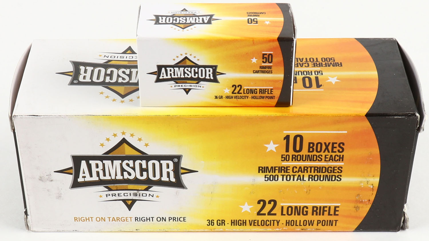 Armscor, Precision, .22 Long Rifle Hollow Point, 36 Grain HP, Full 500rds., 1pc. White orange & black brick, brick is solid with minty color, some corner wear, edges are crisp, end flaps are solid, inside boxes are mint. Grade: Excellent + - Value: 20 to 60