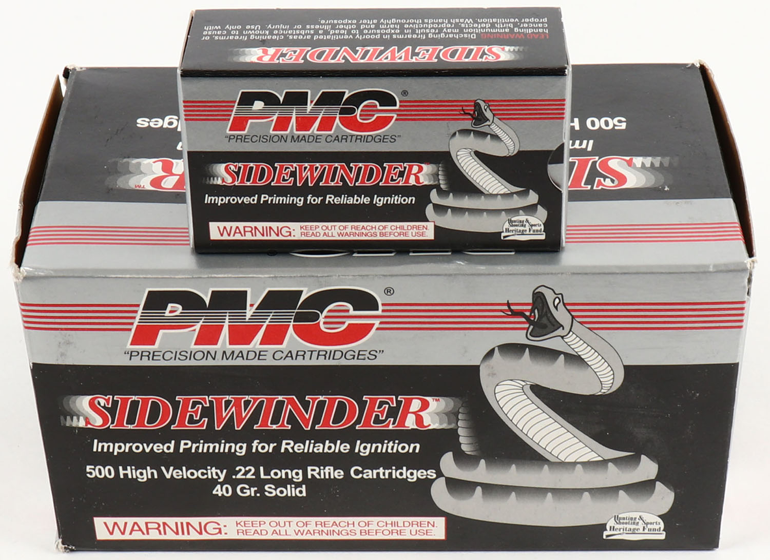 PMC, Sidewinder, .22 Long Rifle, 40 Grain Solid, Full, 500rds., 1pc. Black silver & red brick, brick is near mint with minty color, very minor corner wear, edges are crisp, end flaps are solid, inside boxes are minty. Grade: Excellent ++ - Value: 40 to 120