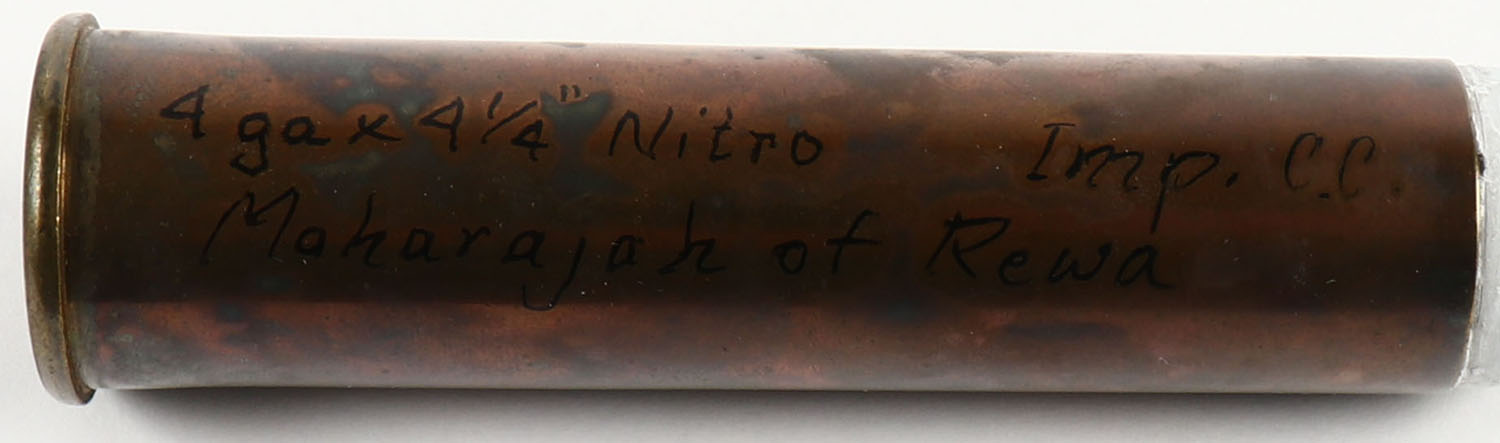 Imperial Cartridge Company, Specially Loaded Nitro Cartridges, 4-Bore, 4 1/4'' Case, 1960 Grain Bullets, Partial 1rd. 2pc. Wood box with yellow & black wraparound reproduction(?) label, box is solid with very good to excellent color, the cartridges case has been written on, and the lead appears to have been coated in a protective white paint. Grade: Very Good ++ - Value: 200 to 600