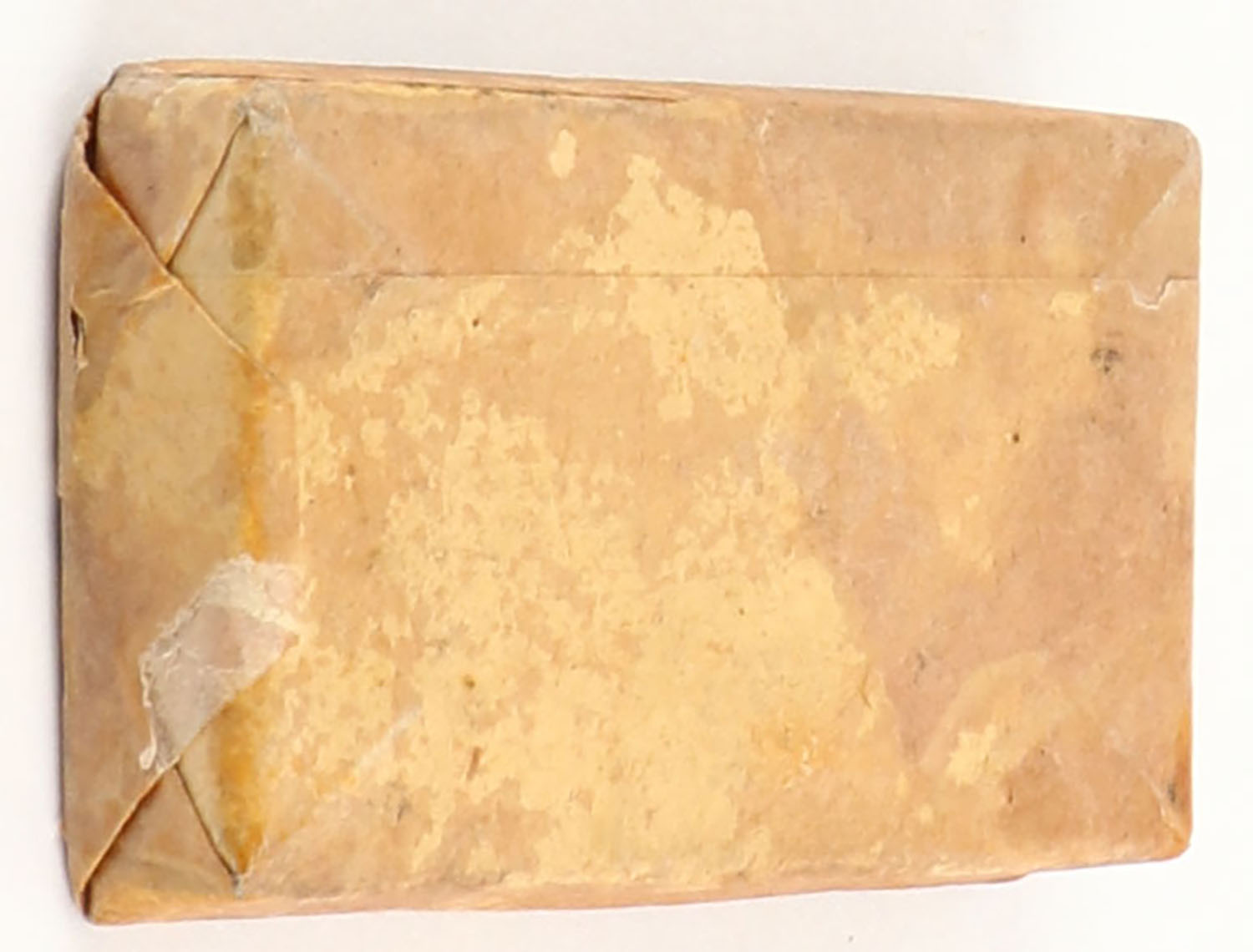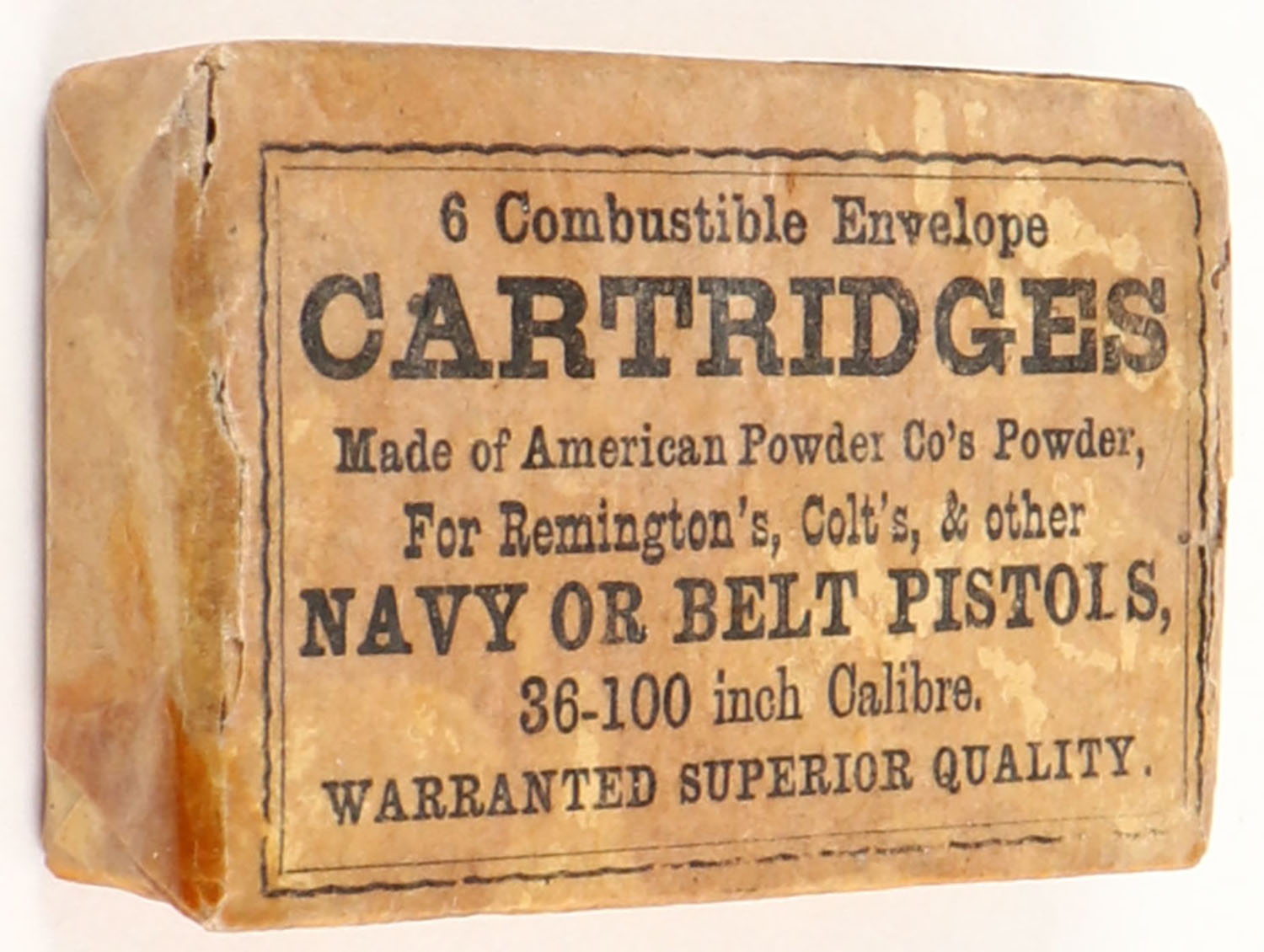 American Powder Co., 6 Combustible Envelope Cartridges, For Remington's, Colt's, & other Navy or Belt Pistols, 36-100 Calibre, FULL & SEALED, 1pc. Buff packet with black printing, packet is solid with very good color, some age soiling, minor edge wear, very minor corner wear. Grade: Very Good ++ - Value: 100 to 400