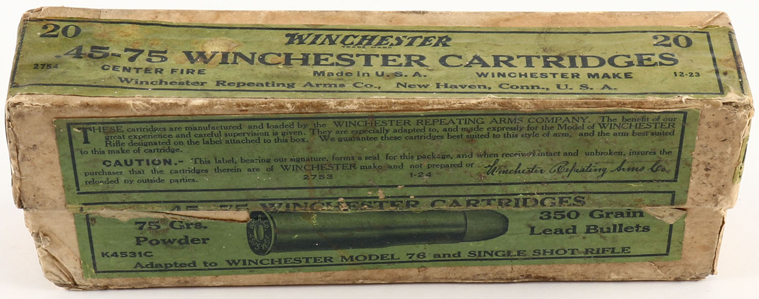 Winchester, Center Fire, .45-75 Winchester, 350 Grain Lead Bullets, Full, 2pc. Buff box with green labels, box is solid with very good color, partial seam splits to bottom end edges, some age soiling & staining, edge & corner wear, labels are intact, ammo is excellent. Grade: Very Good ++ - Value: 60 to 180