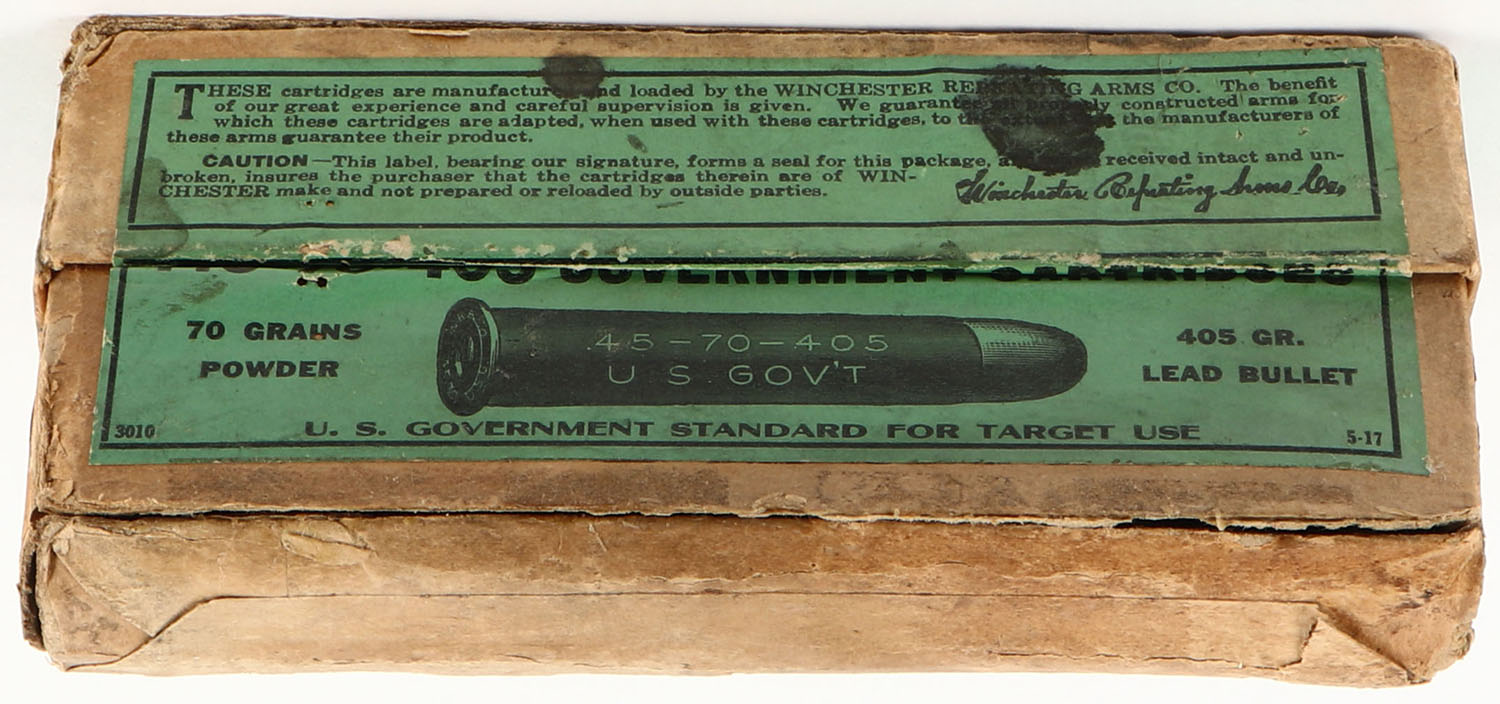 Winchester, Government Cartridges, .45-70-405 U.S. Gov't, Full, 2pc. Buff box with green label, bottom of box is completely torn, label is sealed, very good color, some staining, edge & corner wear, partial seam split to top left edge, ammo appears very good. Grade: Good - Value: 30 to 90