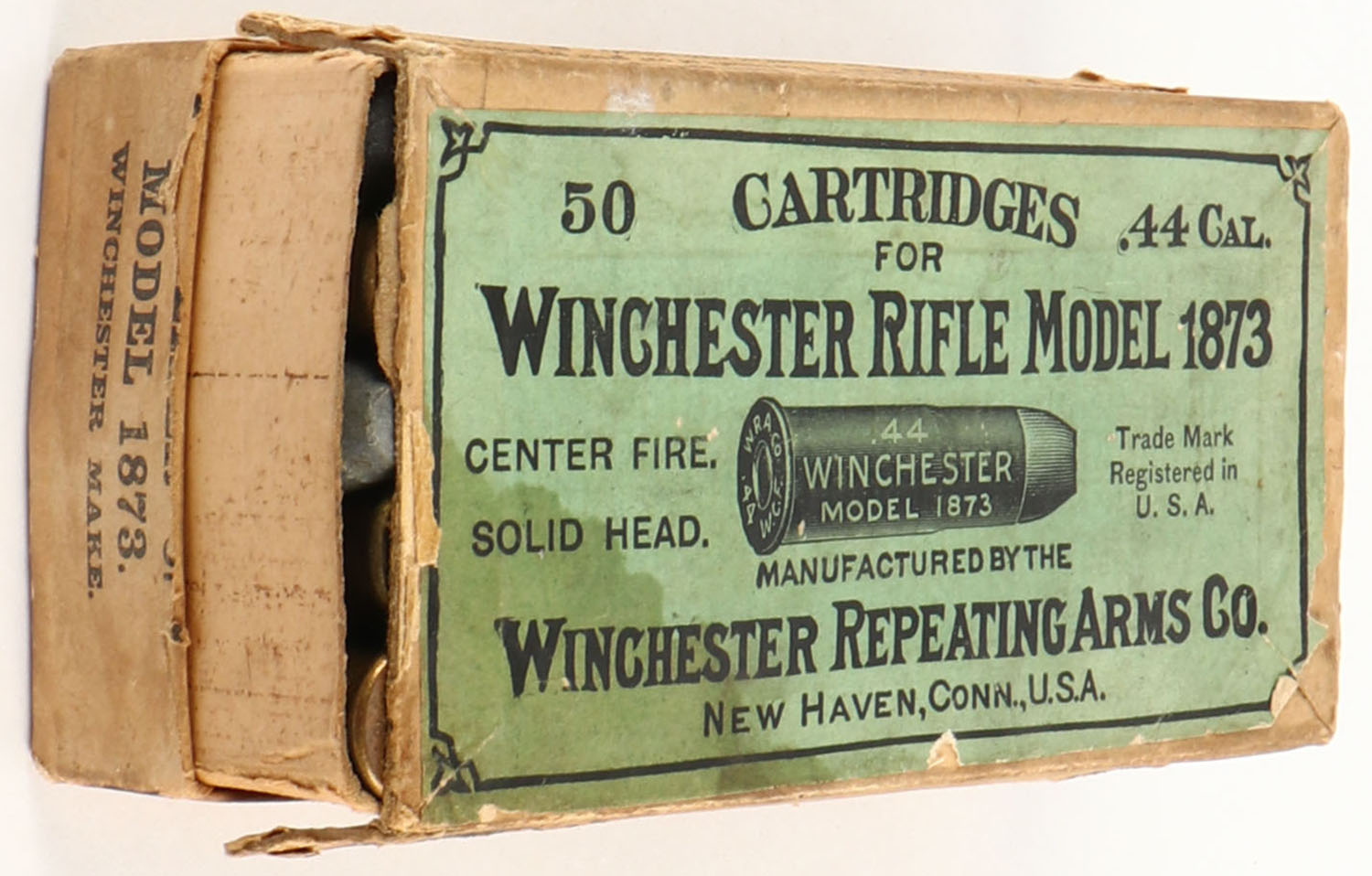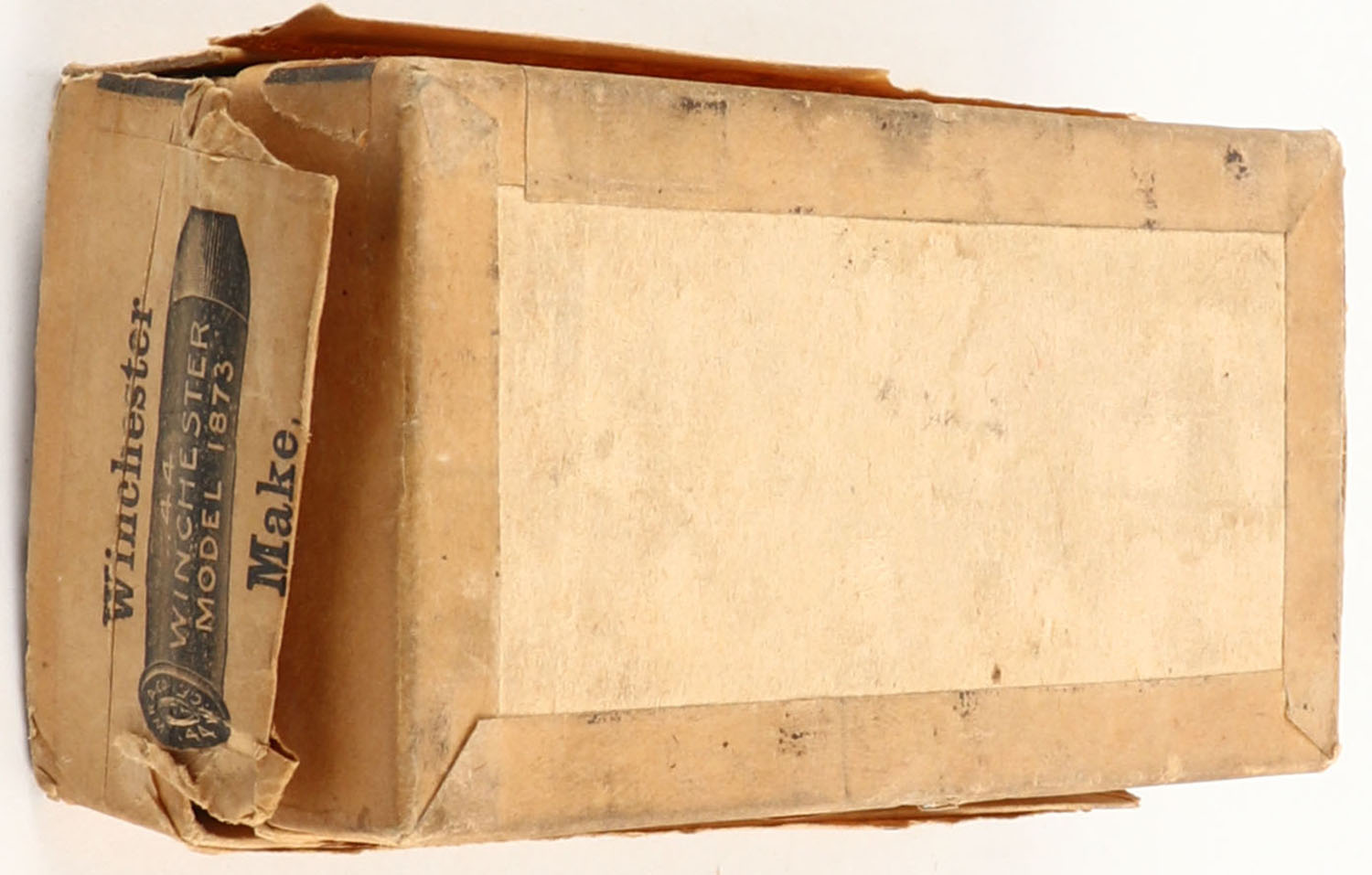 Winchester, Cartridges for Winchester Rifle Model 1873, Solid Head, Full, 2pc. Buff box with green top & buff side sealing labels, lid is missing left end, (2) seam splits to right end edges, very good color, stain on top, some edge & corner wear, side sealing label is 90% intact, ammo is excellent. Grade: Good ++ - Value: 120 to 360