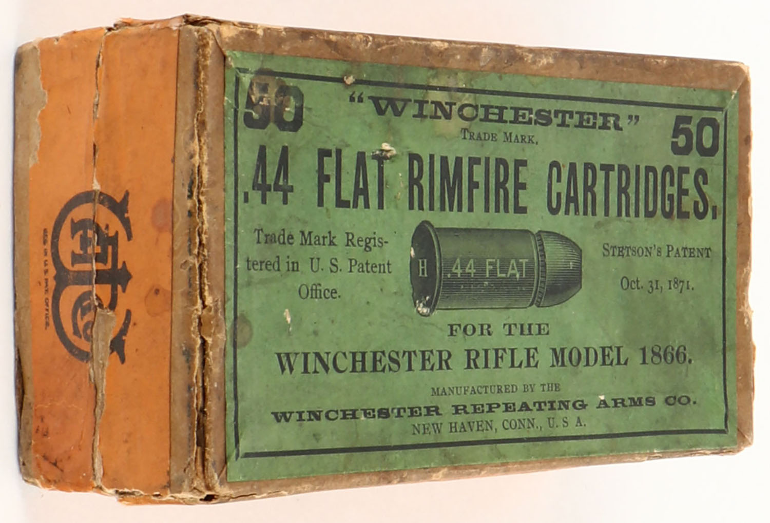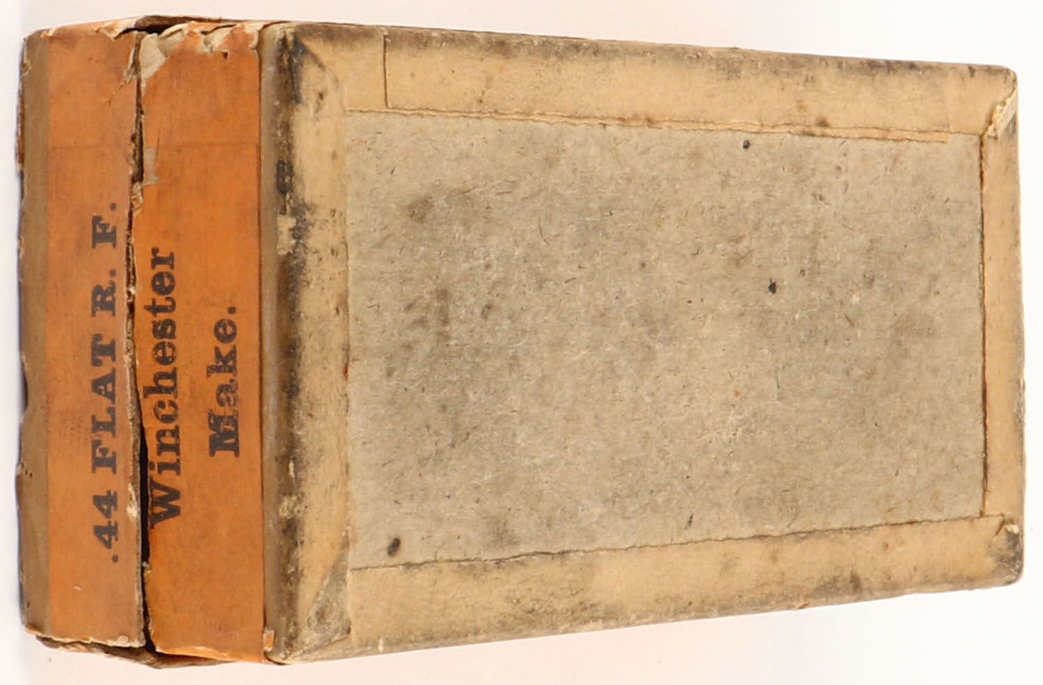 Winchester, Rimfire Cartridges, .44 Flat R.F., Full, 2pc. Buff box with green top & orange side sealing labels, box is solid with very good color, some age soiling, very minor staining, vertical seam splits to front edges of lid, some edge & corner wear, labels are intact, ammo is fair. Grade: Very Good + - Value: 700 to 2100