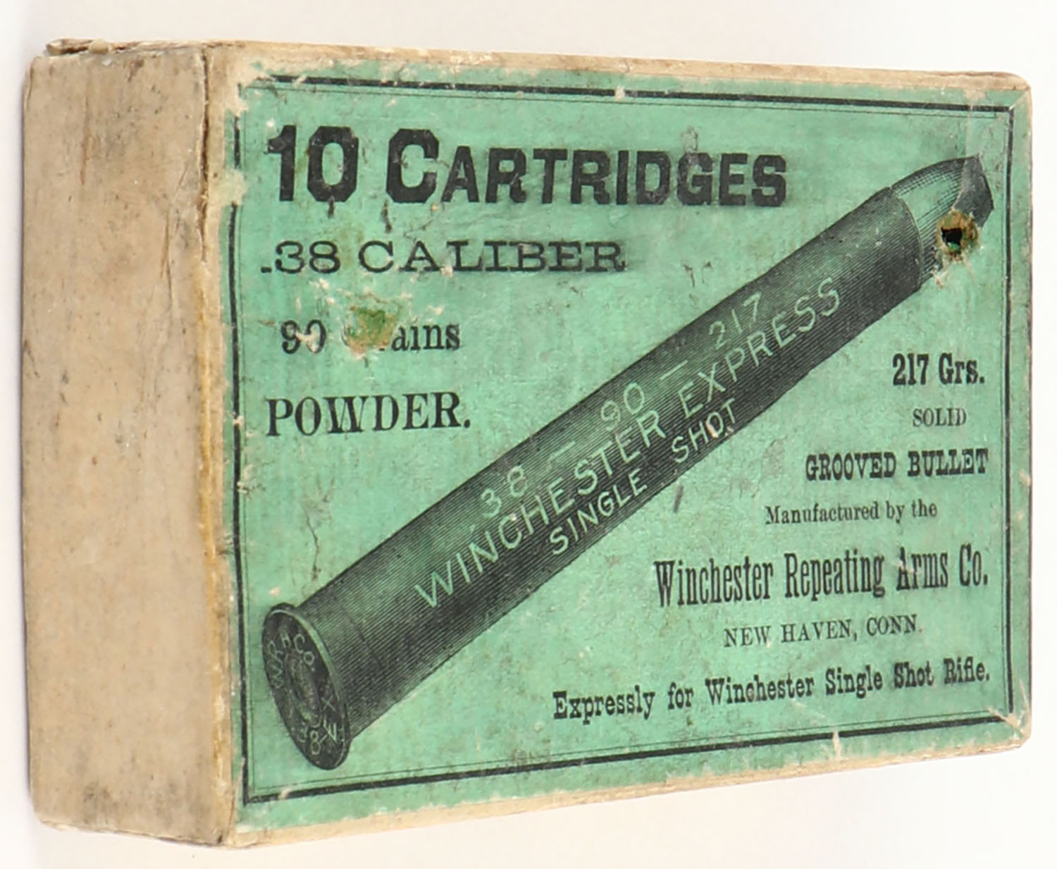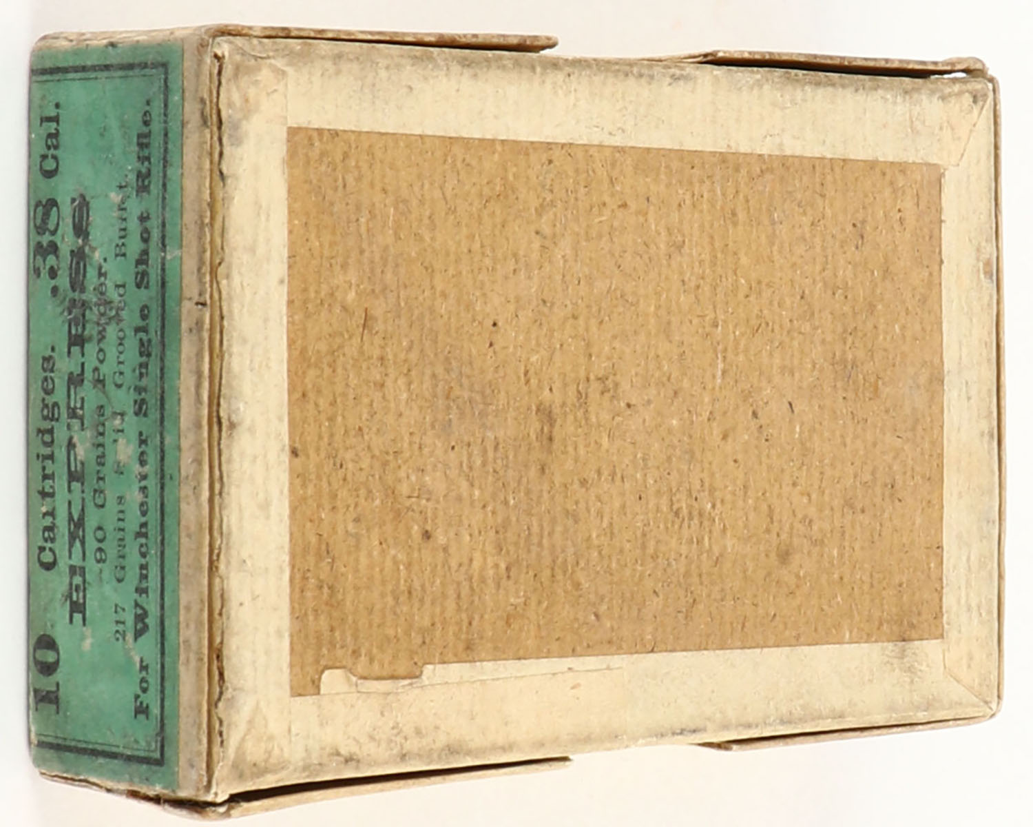 Winchester, .38-90-217 Winchester Express, 217 Grains Grooved Bullet, Full, 2pc. Buff box with green top label, box is solid with very good color, minor age soiling & shelf wear, puncture on top, some edge & corner wear, label is intact, ammo is excellent. Grade: Excellent - Value: 200 to 600