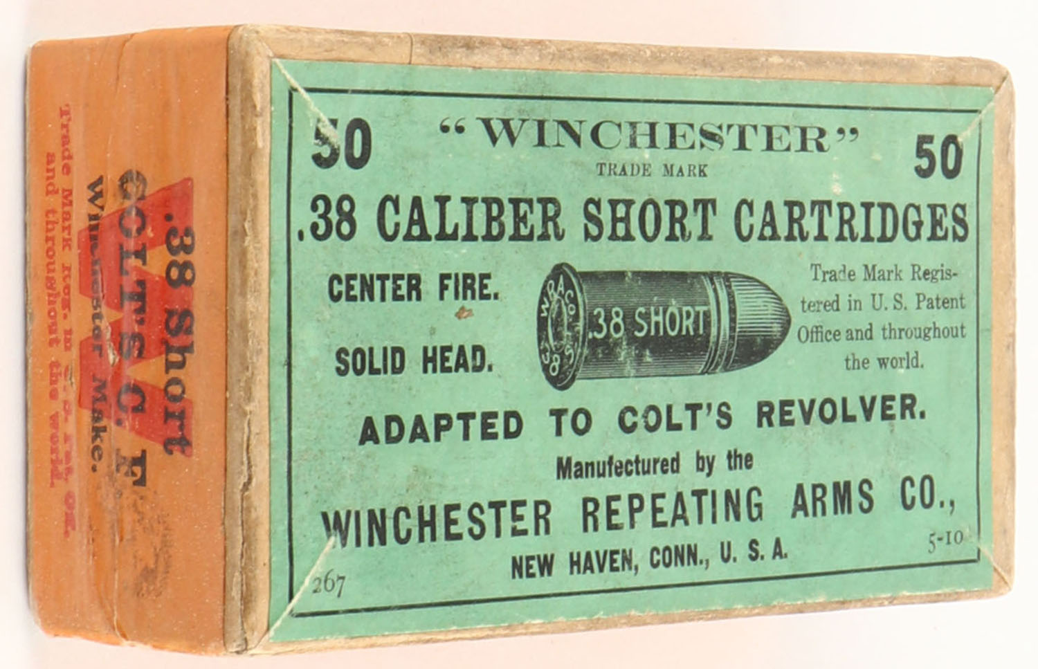 Winchester, Center Fire, .38 Short Colt, FULL & SEALED, 2pc. Buff box with green top & orange side sealing labels, box is solid with excellent color, very minor age soiling, very minor edge & corner wear, label is intact, partially unsealed on back side. Grade: Excellent - Value: 50 to 150