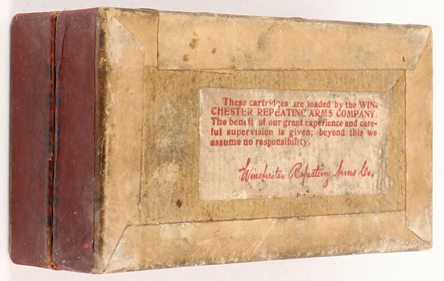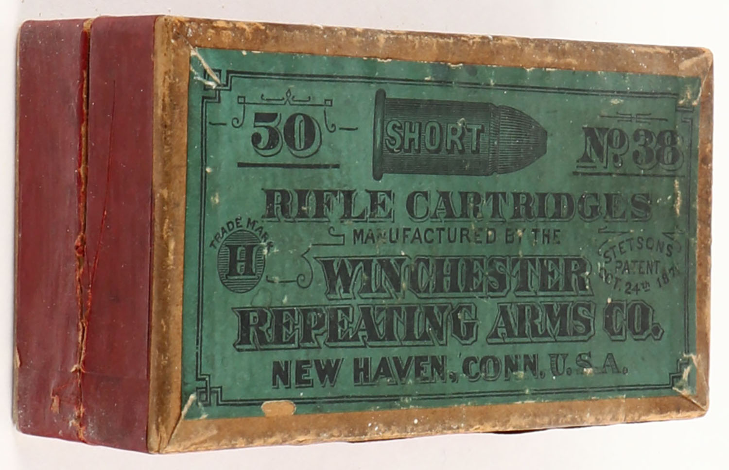 Winchester, Rifle Cartridges, .38 Short Rim Fire, Full, 2pc. Buff box with green top & red side sealing labels, box is solid with very good color, some age soiling & shelf wear, some edge & corner wear, labels are intact, ammo is fair to good. Grade: Very Good + - Value: 50 to 150