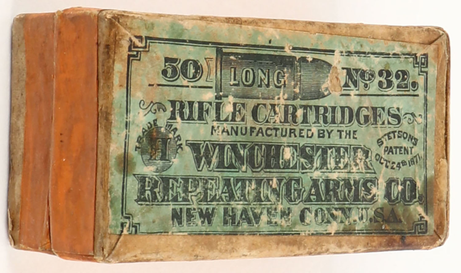 Winchester, Rifle Cartridges, .32 Long Rim Fire, Partial 33rds., 2pc. Buff box with green top & orange side sealing labels, box is solid with fair color, age soiling, some staining & shelf wear, corner wear, minor edge wear, labels are intact, ammo is fair. Grade: Good ++ - Value: 20 to 60
