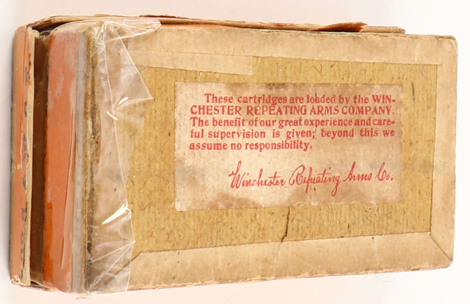 Winchester, Central Fire, .32 Smith & Wesson, Full of mixed H/S, 2pc. Buff box with green top & orange side sealing labels, box is solid with very good to excellent color, very minor age soiling & shelf wear, vertical seam splits to all corners of lid, edge & corner wear, labels are intact, ammo is excellent. Grade: Very Good - Value: 10 to 50