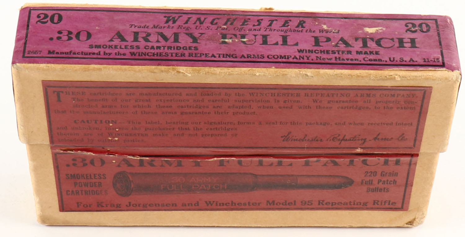 Winchester, Smokeless Powder Cartridges, .30 Army (.30-40 Krag), 220 Grain Full Patch Bullets, FULL & SEALED, 2pc. Buff box with purple & red labels, box is solid with excellent color, some corner wear, minor edge wear, labels are intact. Grade: Excellent ++ - Value: 40 to 120