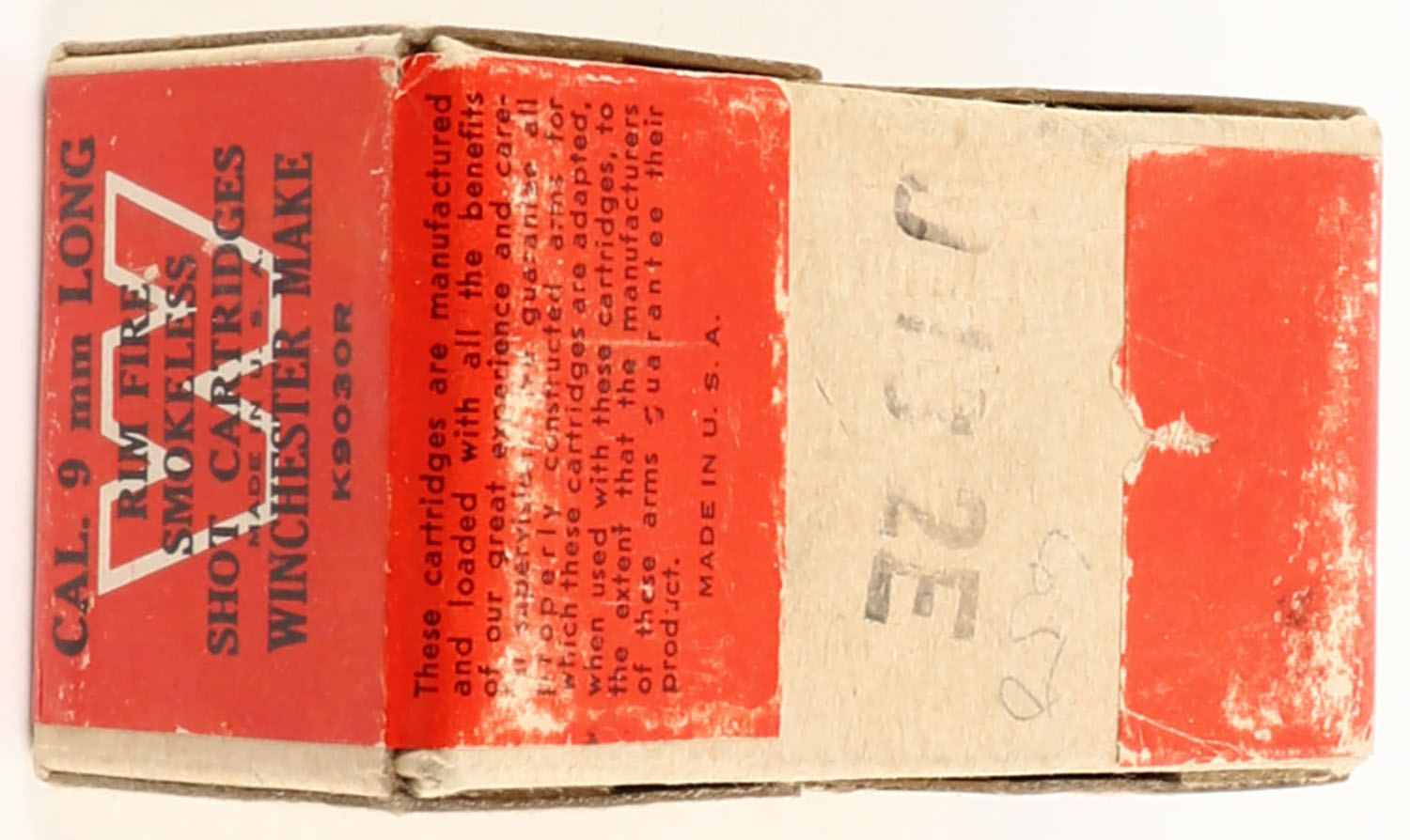Winchester, 9mm Long Shot Cartridges, Rim Fire, FULL & SEALED, 2pc. Buff box with red wraparound label, box is solid with excellent color, very minor color fading & shelf wear, very minor corner wear, edges are crisp, label is intact. Grade: Excellent + - Value: 150 to 450