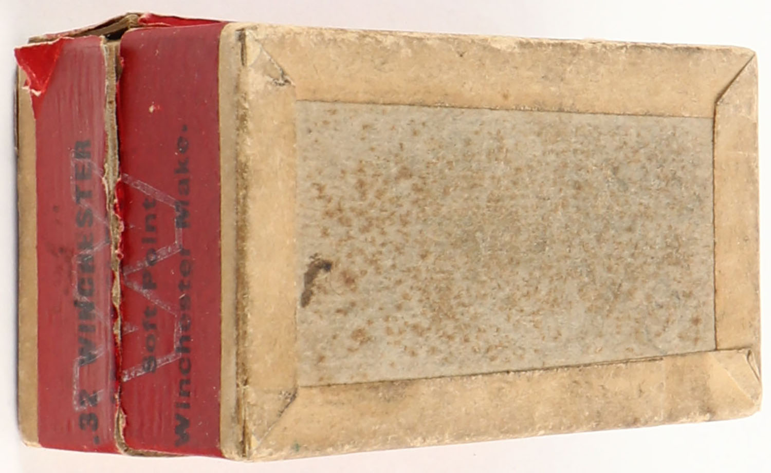 Winchester, Center Fire Cartridges, .32 Winchester, Smokeless, 116 Grain Soft Point, Partial 7rds., 2pc. Buff box with red top & side sealing labels, box is solid with excellent color, very minor age soiling, some edge & corner wear, labels are intact, ammo is good. Grade: Excellent - Value: 10 to 40