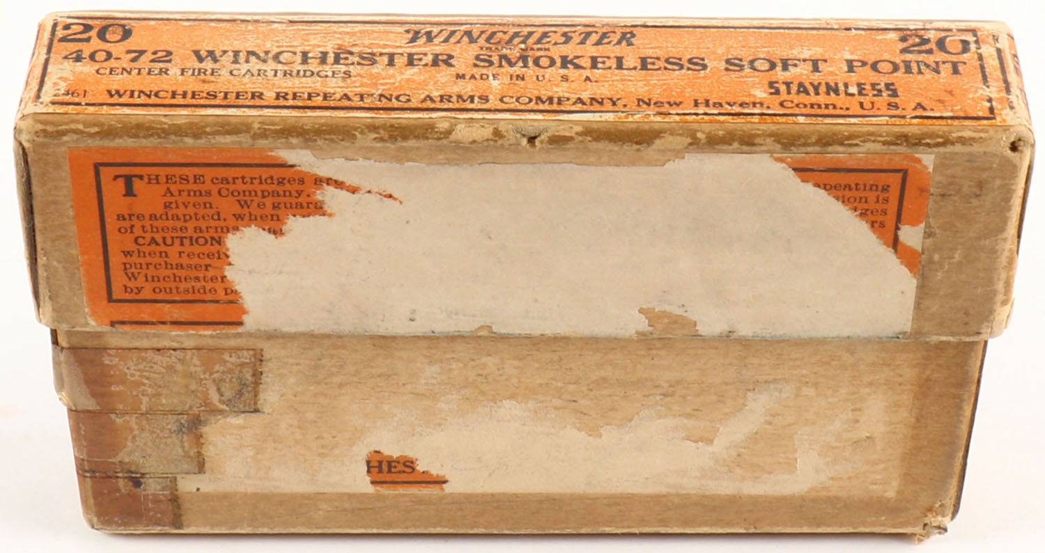 Winchester, Staynless, .40-72 Winchester, Smokeless, Full, 2pc. Buff box with orange labels, box is solid with very good color, some color fading & shelf wear, minor edge & corner wear, front label is mostly torn off, ammo is excellent. Grade: Very Good - Value: 40 to 120