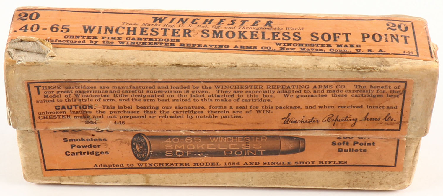 Winchester, Center Fire Cartridges, .40-65 Winchester, Smokeless, 260 Grain Soft Point Bullets, FULL & SEALED, 2pc. Buff box with orange labels, box is solid with very good to excellent color, some age soiling, some edge & corner wear, labels are intact. Grade: Excellent - Value: 80 to 240