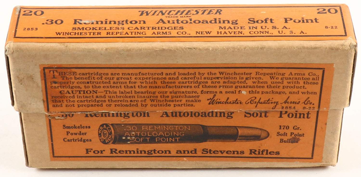 Winchester, Smokeless Powder Cartridges, .30 Remington Autoloading, 170 Grain Soft Point Bullet, Full, 2pc. Buff box with orange labels, box is solid with excellent color, minor staining, some corner wear, very minor edge wear, labels are intact, ammo is excellent. Grade: Excellent - Value: 30 to 90