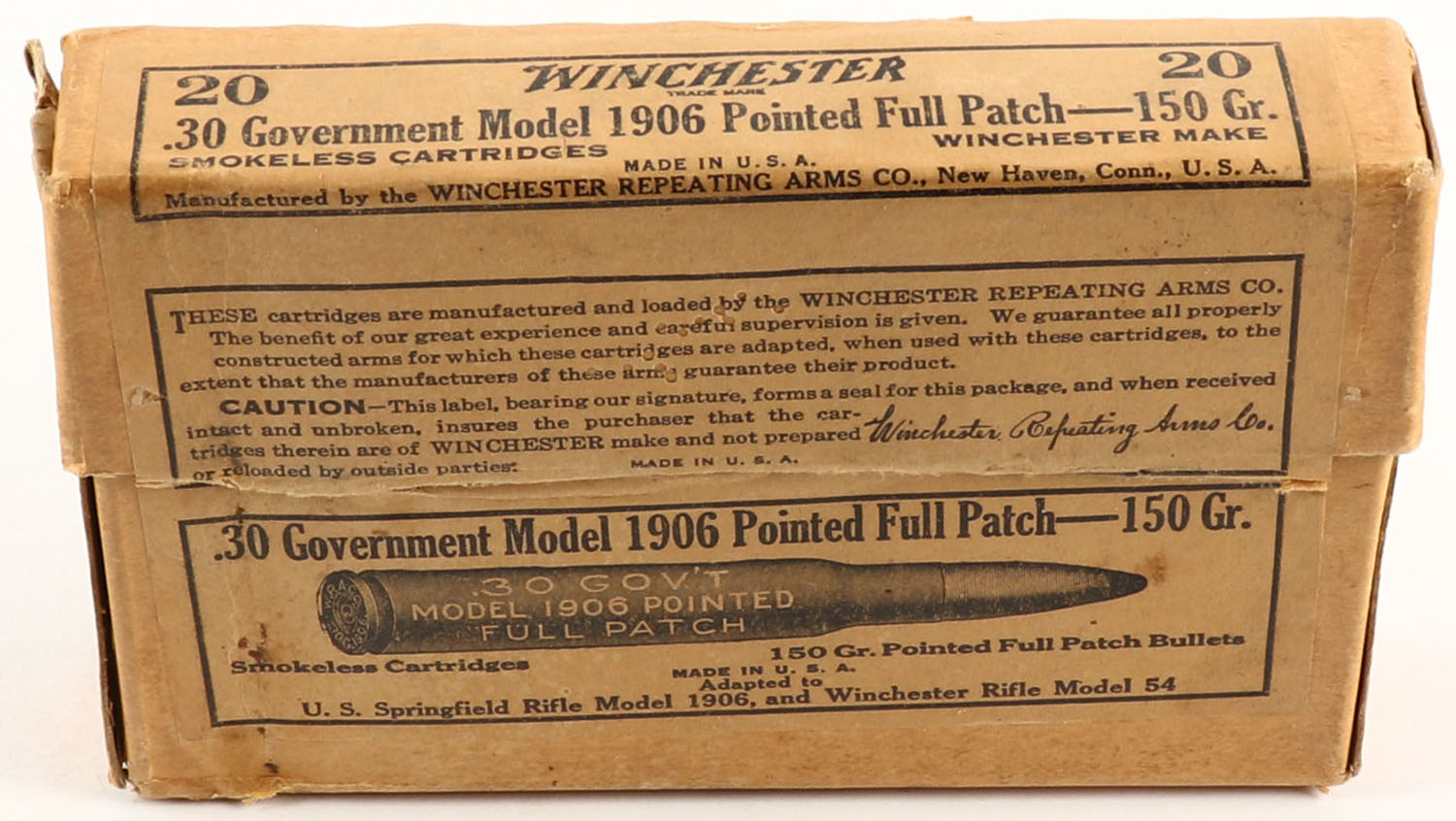 Winchester, Smokeless Cartridges, .30 Government Model 1906 (.30-06), 150 Grain Full Patch Bullets, Full, 2pc. Buff box with buff label, box is solid with excellent color, very minor age soiling & corner wear, edges are mostly crisp, label is intact, ammo is very good to excellent. Grade: Excellent + - Value: 10 to 50