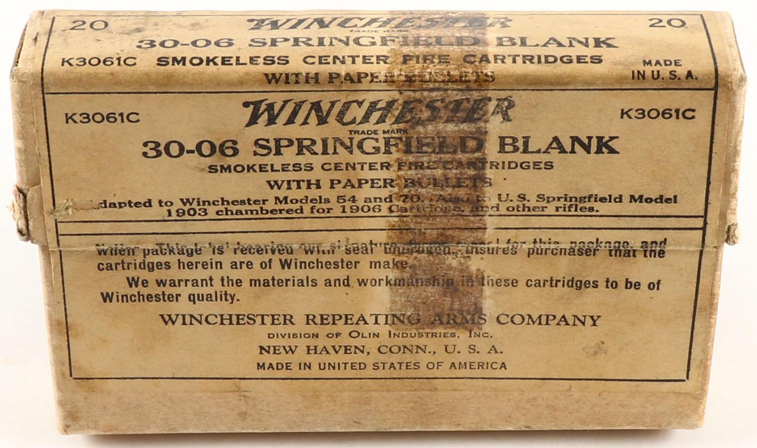Winchester, Smokeless Center Fire Cartridges, .30-06 Springfield Blank, With Paper Bullets, FULL & SEALED, 2pc. Buff box with buff label, box is solid with very good to excellent color, tape stain on top & front, some edge & corner wear, label is intact. Grade: Very Good + - Value: 10 to 50