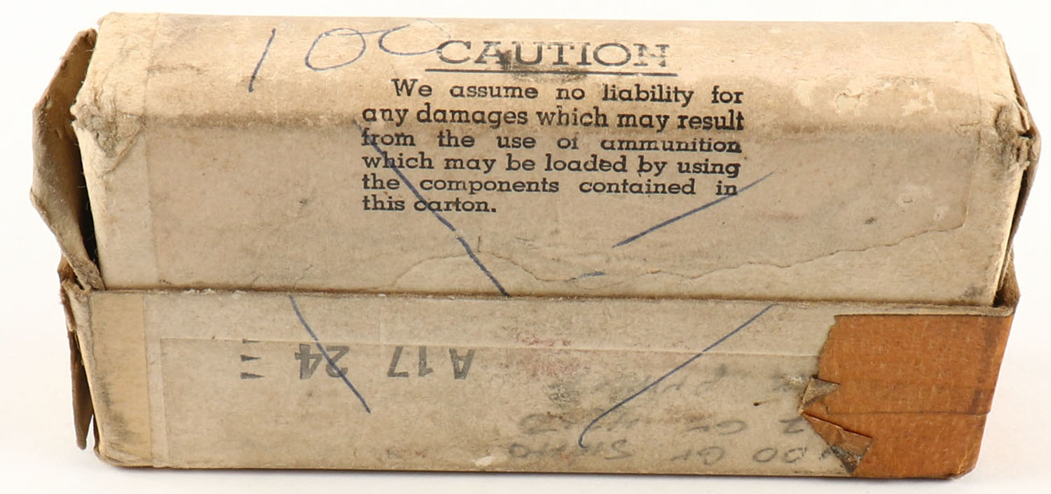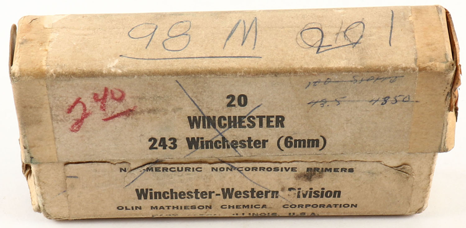 Winchester-Western, .243 Winchester, Non-Mercuric Non-Corrosive Primers, Partial 15rds., 2pc. Buff box with white label, box is solid with very good color, age soiling, box has been written on all sides, corner wear, some edge wear, label is intact, ammo is excellent. Grade: Very Good - Value: 8 to 40