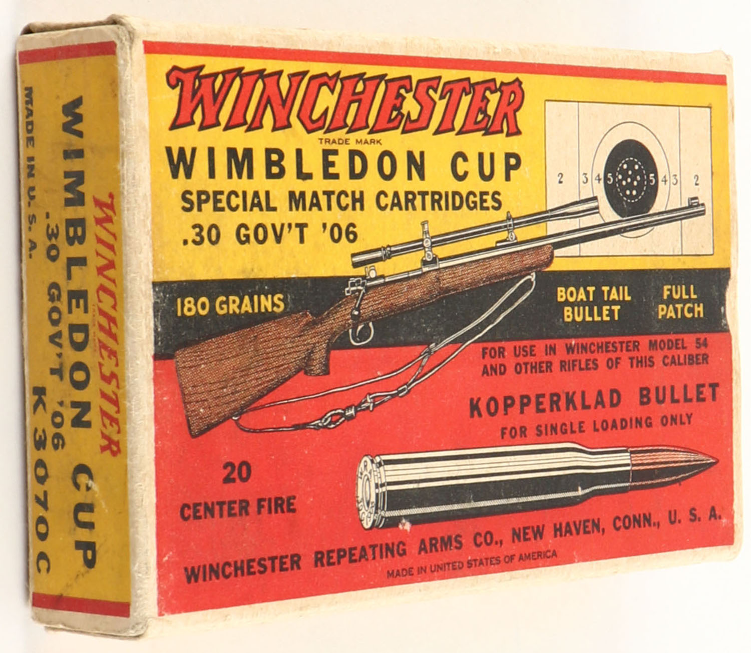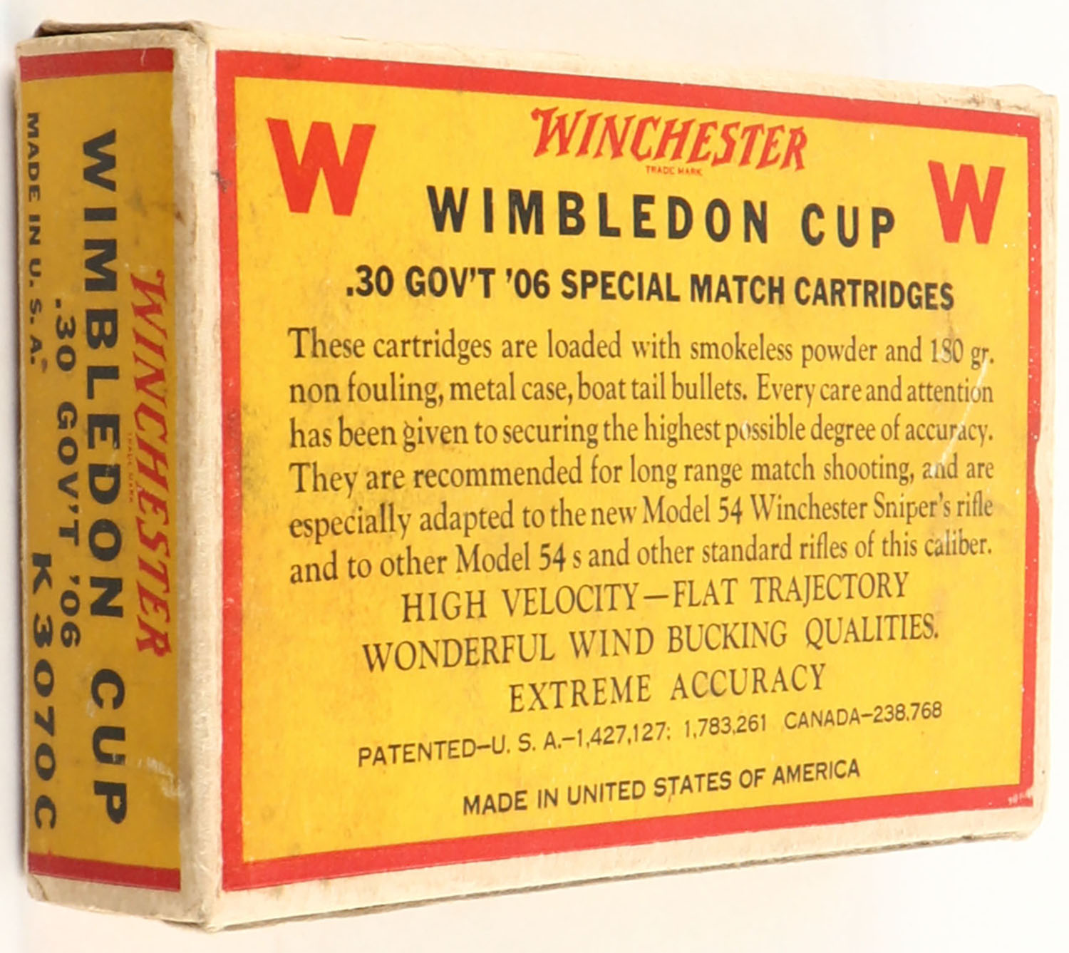 Winchester, Wimbledon Cup Special Match Cartridges, .30 Gov't '06 (.30-06), 180 Grain Full Patch Boat Tail Kopperklad Bullet, For Single Loading Only, Full, 1pc. Red yellow & black box, box is solid with very good to excellent color, very minor age soiling, minor edge & corner wear, end flaps are solid, ammo is excellent. Grade: Excellent + - Value: 100 to 300