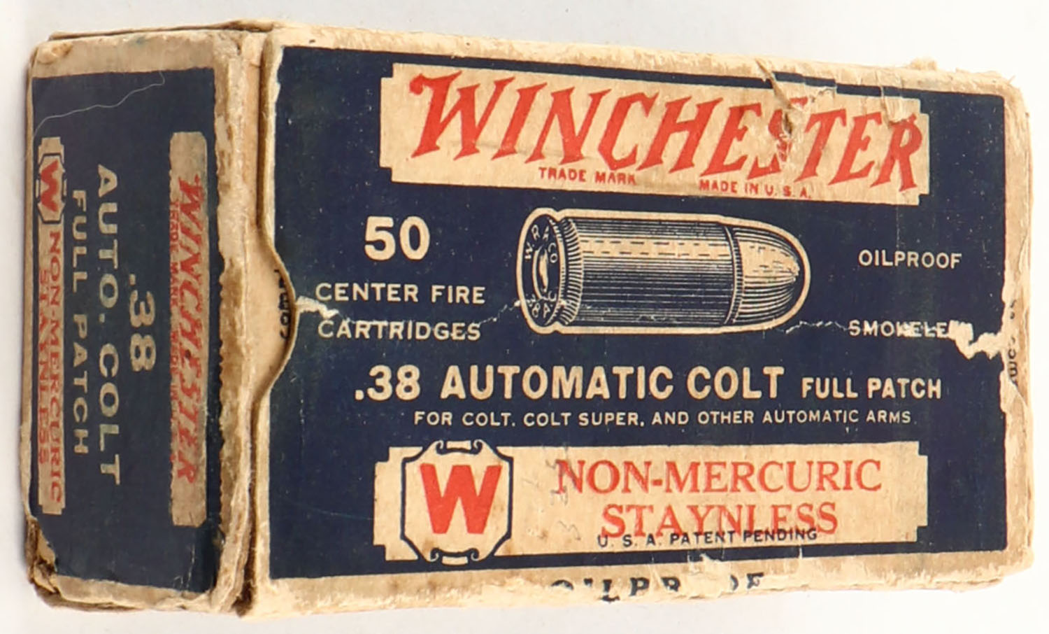 Winchester, Non-Mercuric Staynless, .38 Automatic Colt, Smokeless, Full Patch, Partial 47rds., 1pc. Blue white & red box, insert tab of right end flap is torn & taped, partial seam split to top front edge, edge & corner wear, left end flap is solid, ammo is excellent. Grade: Good ++ - Value: 20 to 80