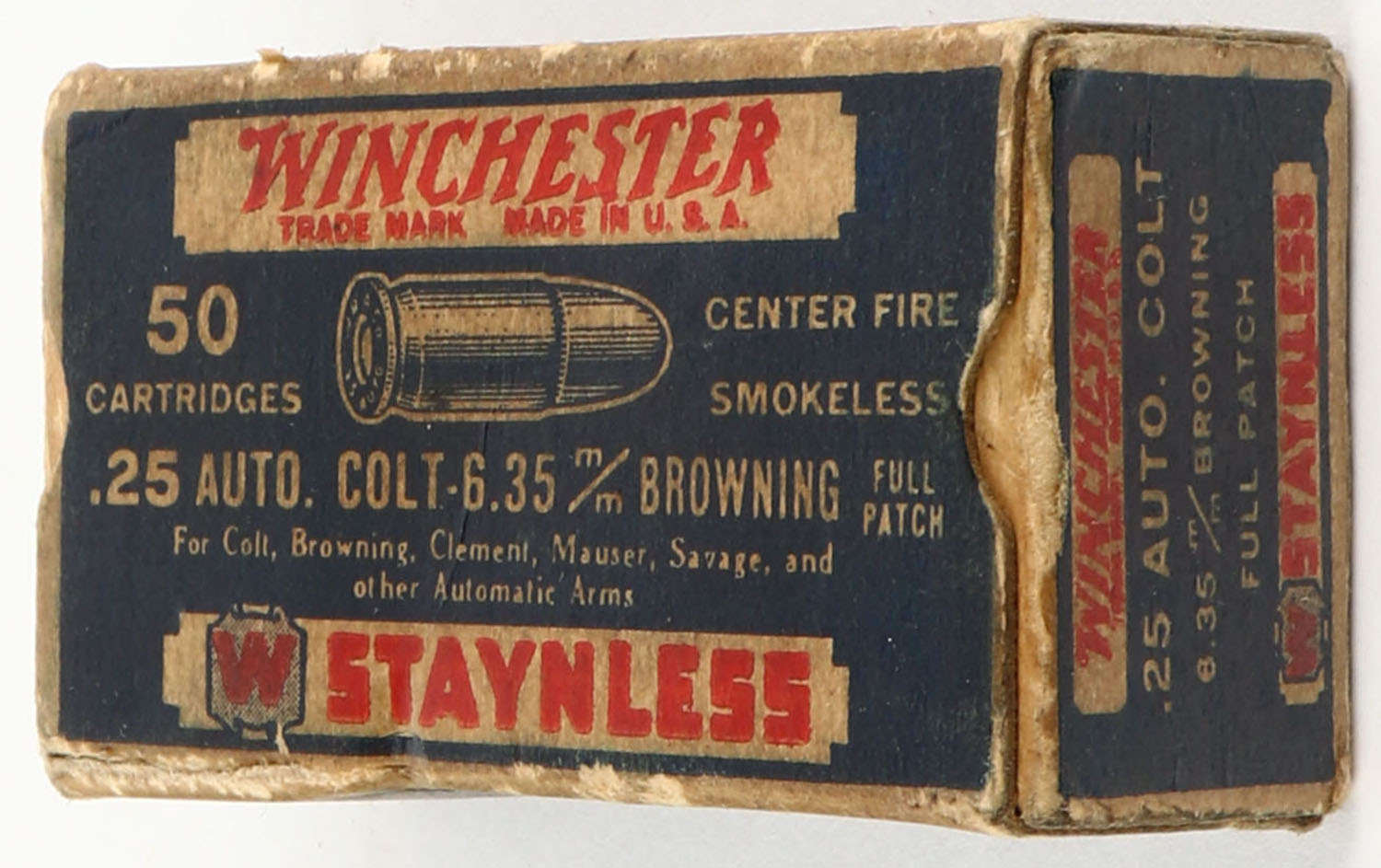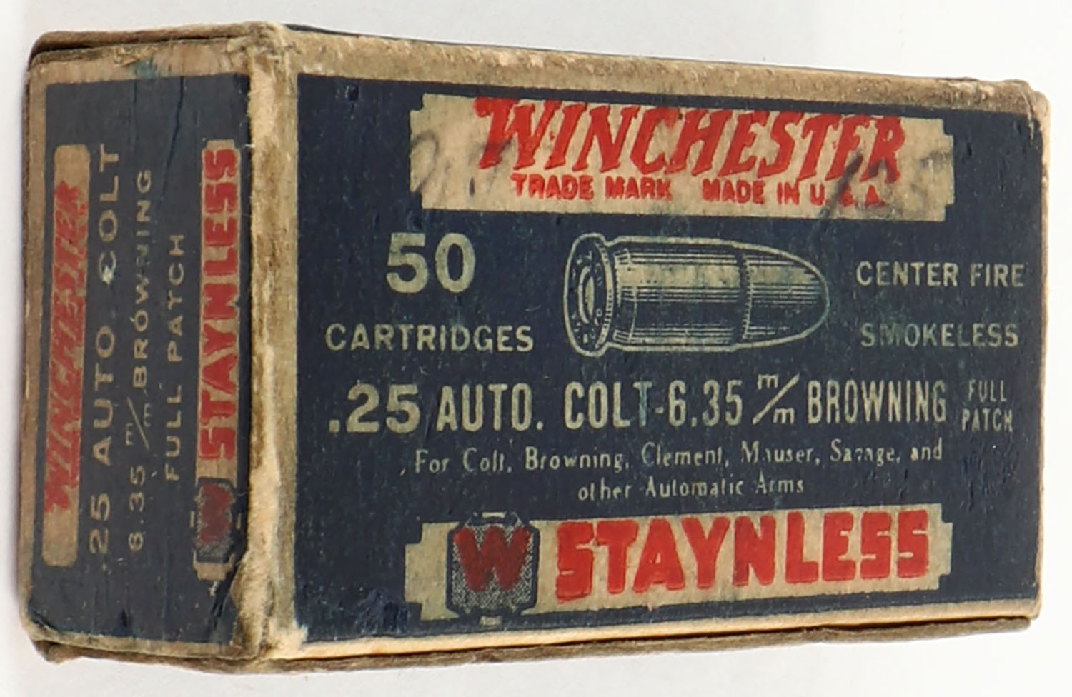 Winchester, Staynless, .25 Automatic Colt, 6.35mm Browning, Full Patch, Full, 1pc. Blue white & red box, box is solid with good to very good color, age soiling, edge & corner wear, end flaps are solid, ammo is excellent. Grade: Very Good + - Value: 16 to 60