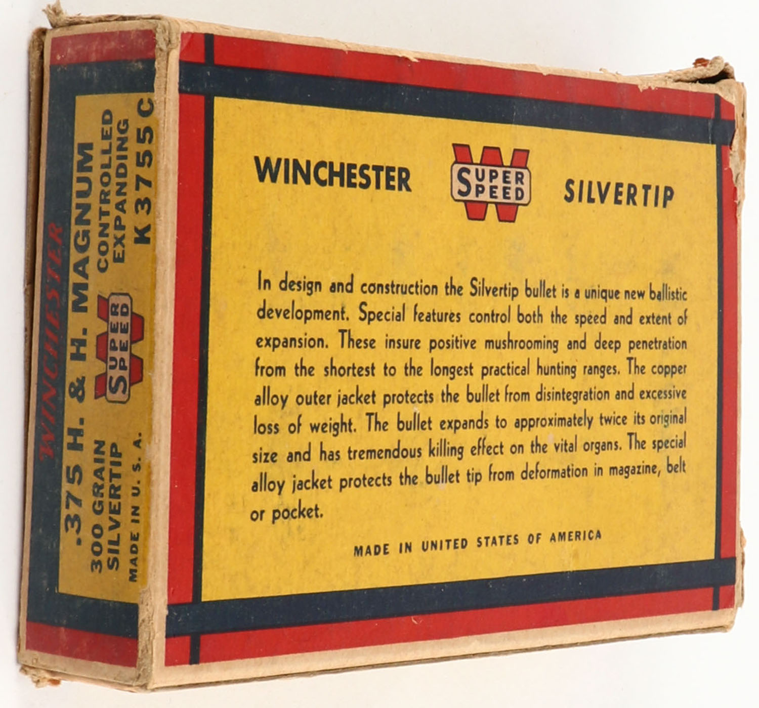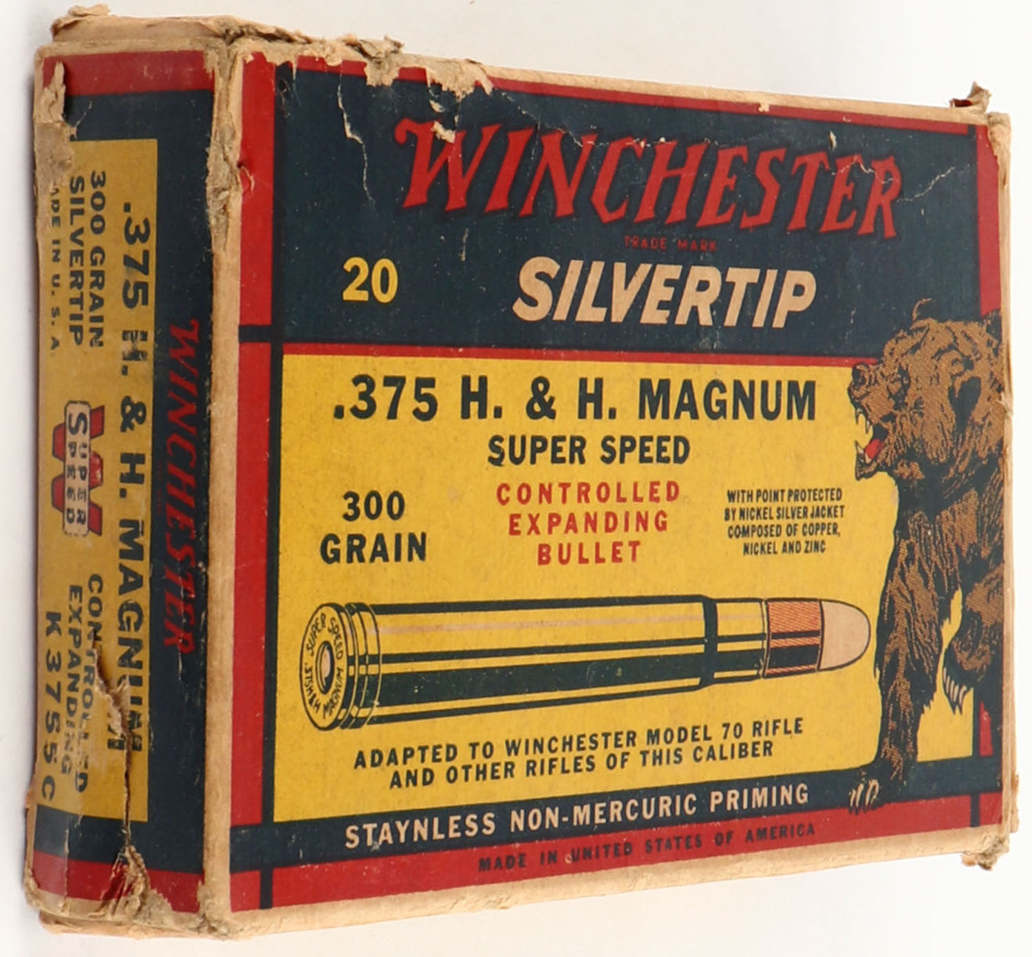 Winchester, Silvertip, .375 H&H Magnum, 300 Grain Controlled Expanding Bullet, Full of brass (18 primed, 2 unprimed), 1pc. Yellow blue & red bear box, box is solid with very good to excellent color, minor age soiling, some edge & corner wear, end flaps are solid, shells are excellent. Grade: Very Good ++ - Value: 16 to 60