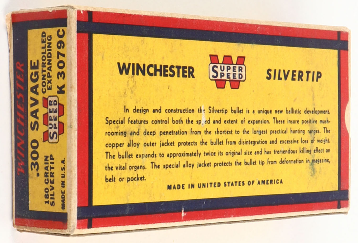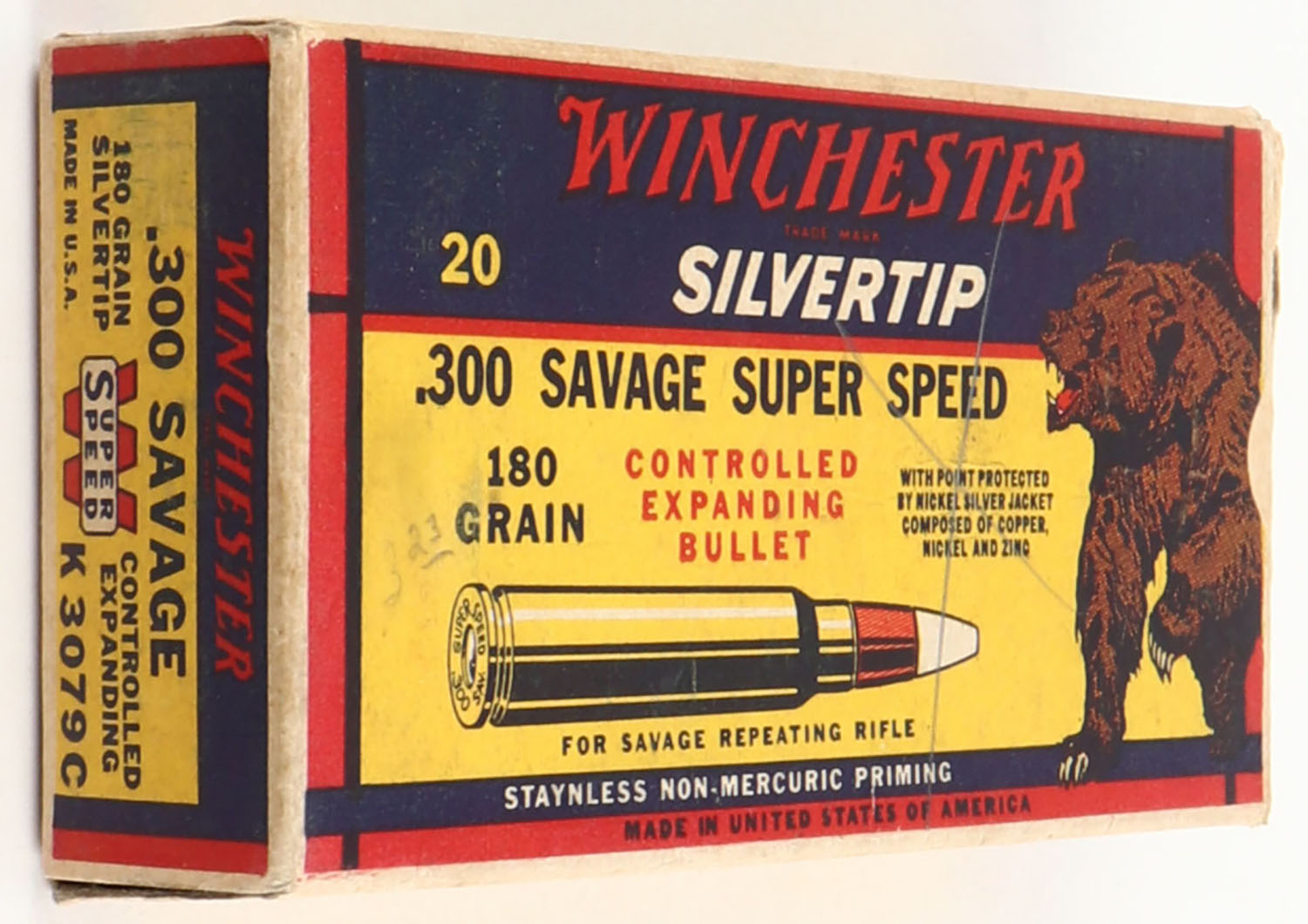 Winchester, Silvertip, .300 Savage, 180 Grain Controlled Expanding Bullet, Full, 1pc. Yellow blue & red bear box, box is solid with excellent color, top has been written on, very minor corner wear, edges are mostly crisp, end flaps are solid, ammo is excellent. Grade: Excellent - Value: 50 to 200