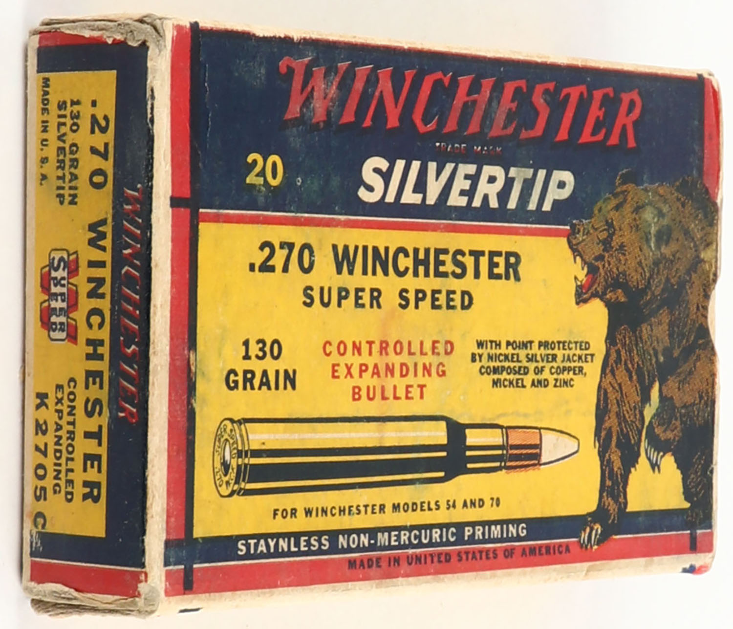 Winchester, Silvertip, .270 Winchester, 130 Grain Controlled Expanding Bullet, Full, 1pc. Yellow blue & red bear box, box is solid with very good color, some age soiling & shelf wear, corner wear, very minor edge wear, end flaps are solid, ammo is excellent. Grade: Very Good ++ - Value: 20 to 80