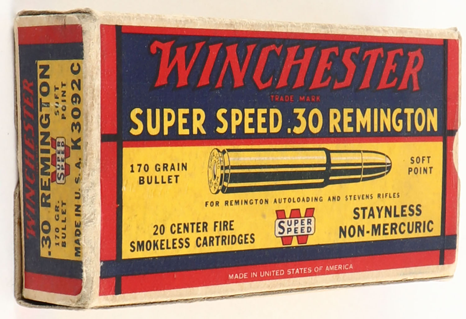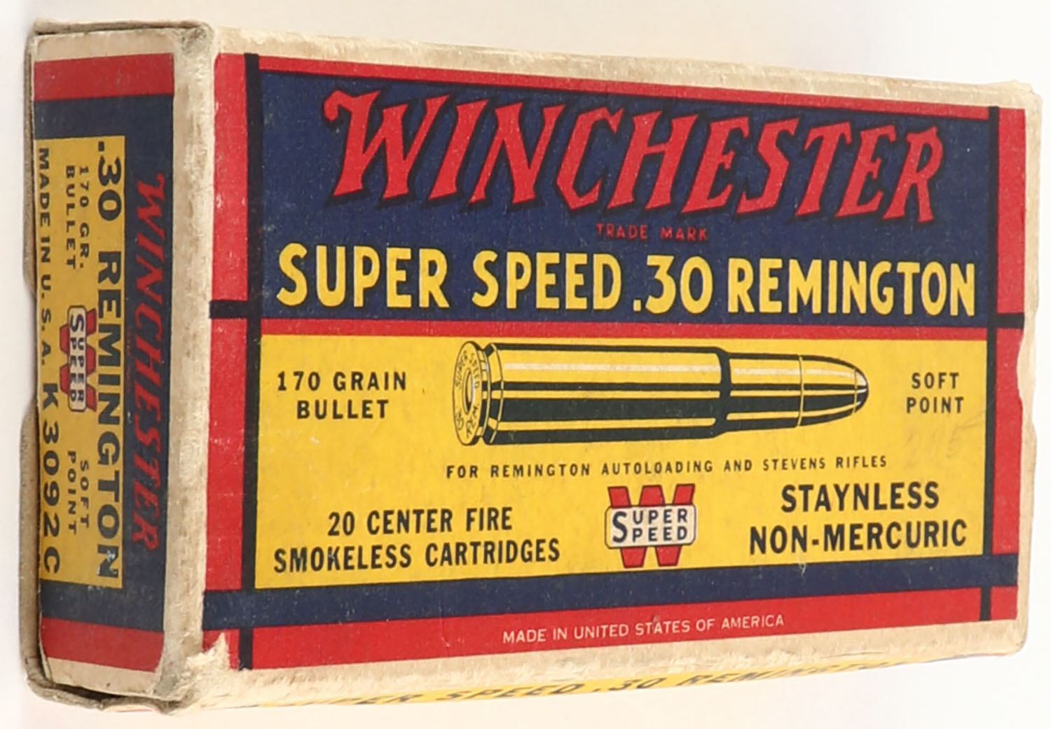 Winchester, Super Speed, .30 Remington, 170 Grain Soft Point Bullet, Full, 1pc. Yellow blue & red box, box is solid with excellent color, minor edge & corner wear, end flaps are solid, ammo is excellent. Grade: Excellent - Value: 30 to 90