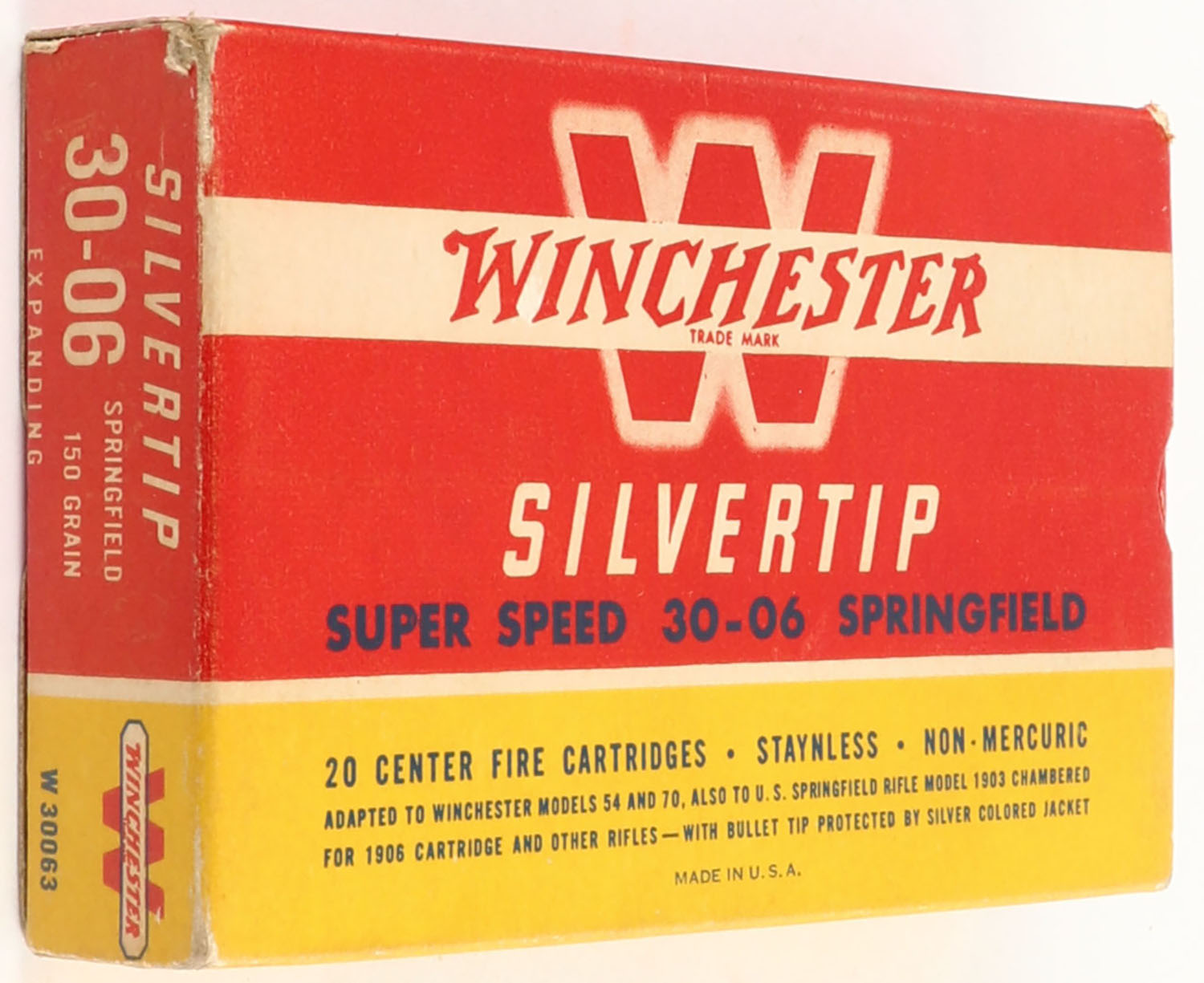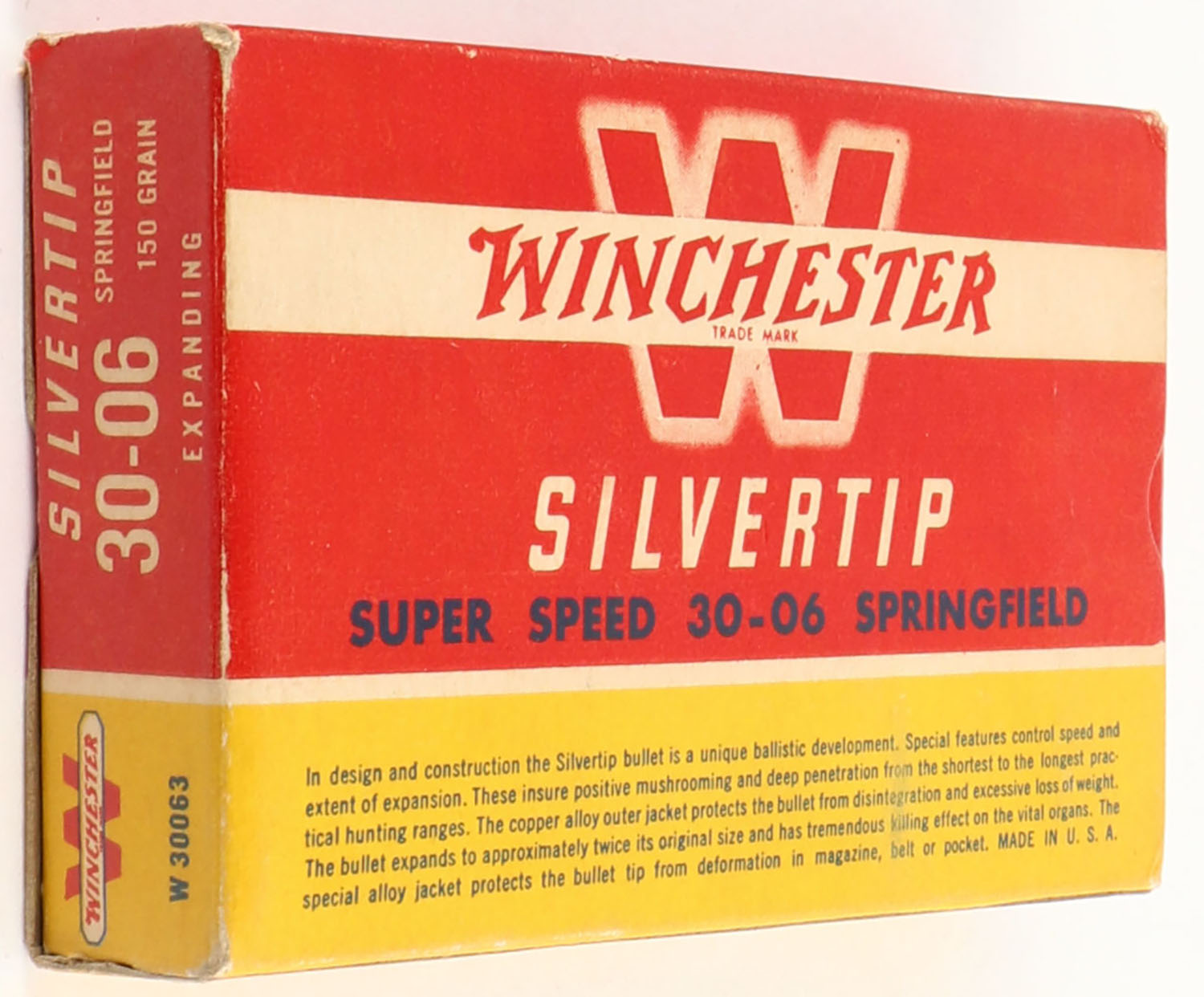 Winchester, Silvertip Super Speed, .30-06 Springfield, 150 Grain Controlled Expanding Bullet, Full, 1pc. Red yellow & white box, box is solid with excellent color, minor corner wear, edges are crisp, end flaps are solid, ammo is excellent. Grade: Excellent + - Value: 16 to 60