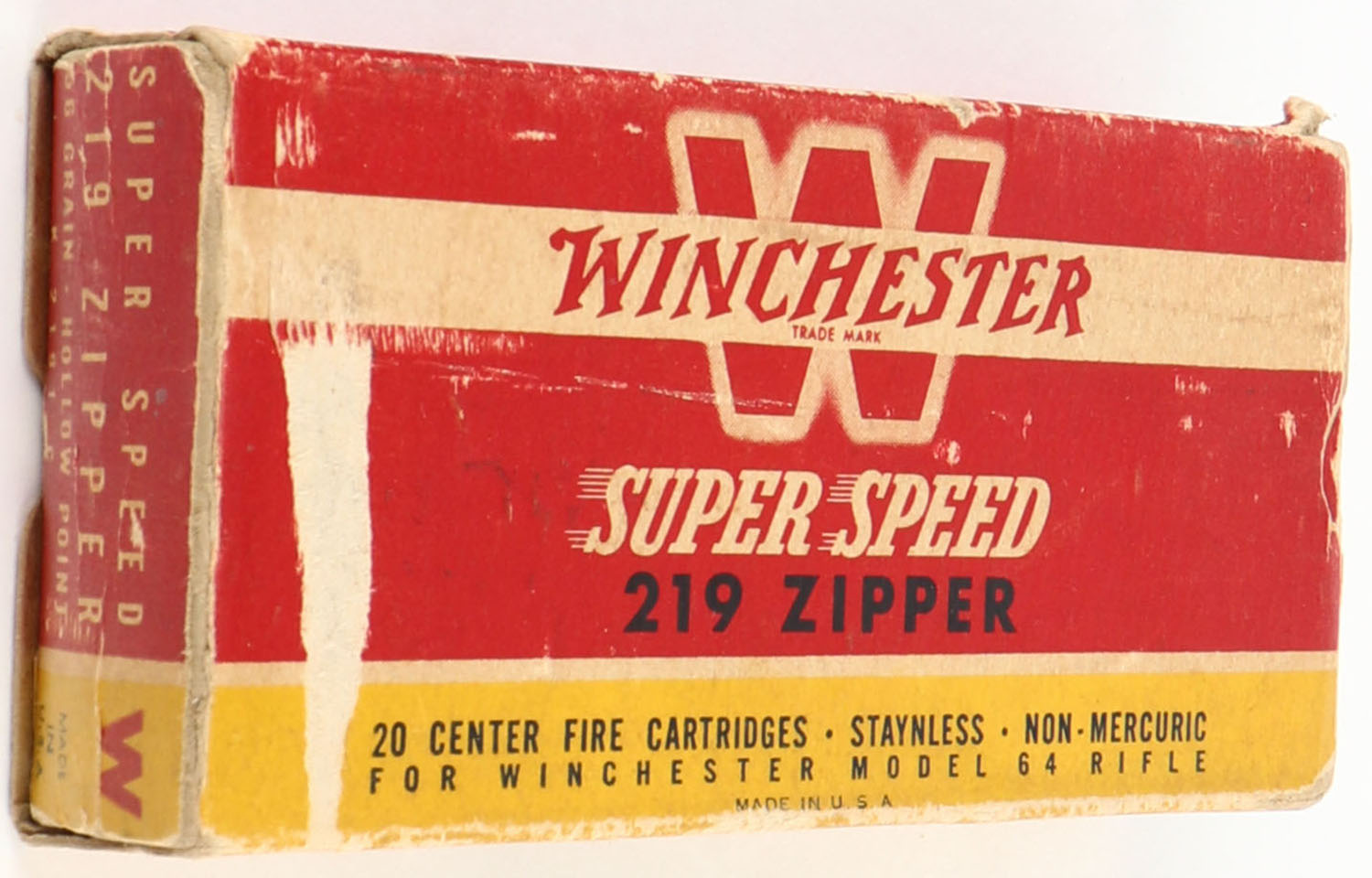 Winchester, Super Speed, .219 Zipper, 56 Grain Hollow Point, Full, 1pc. Red yellow & white box, right end flap is torn & taped, very good color, some age soiling & shelf wear, scuff on top, corner wear, minor edge wear, left end flap is solid, ammo is excellent. Grade: Very Good + - Value: 50 to 150