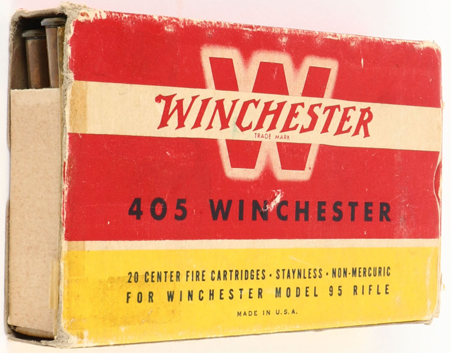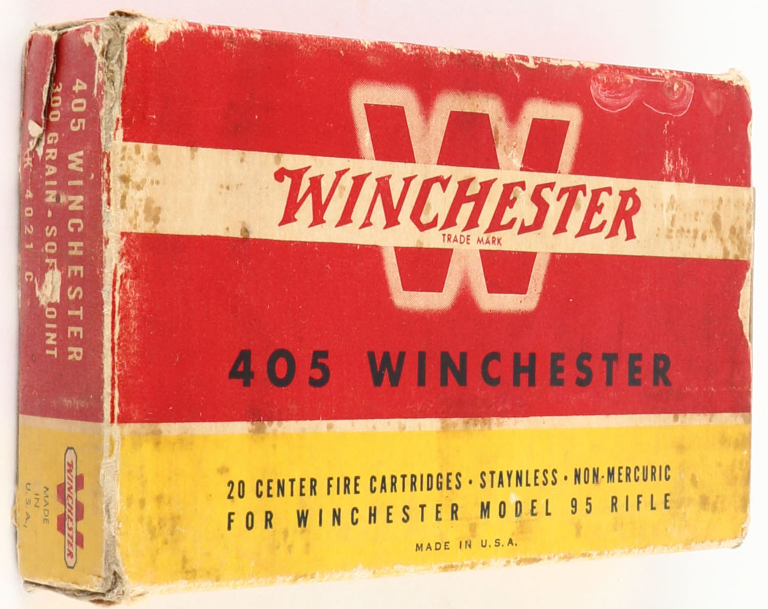 Winchester, Center Fire Cartridges, .405 Winchester, 300 Grain Soft Point, Full, 1pc. Red yellow & white box, missing right end flap, very good color, some age soiling & staining, corner wear, minor edge wear, left end flap is solid, ammo is excellent. Grade: Good ++ - Value: 50 to 150