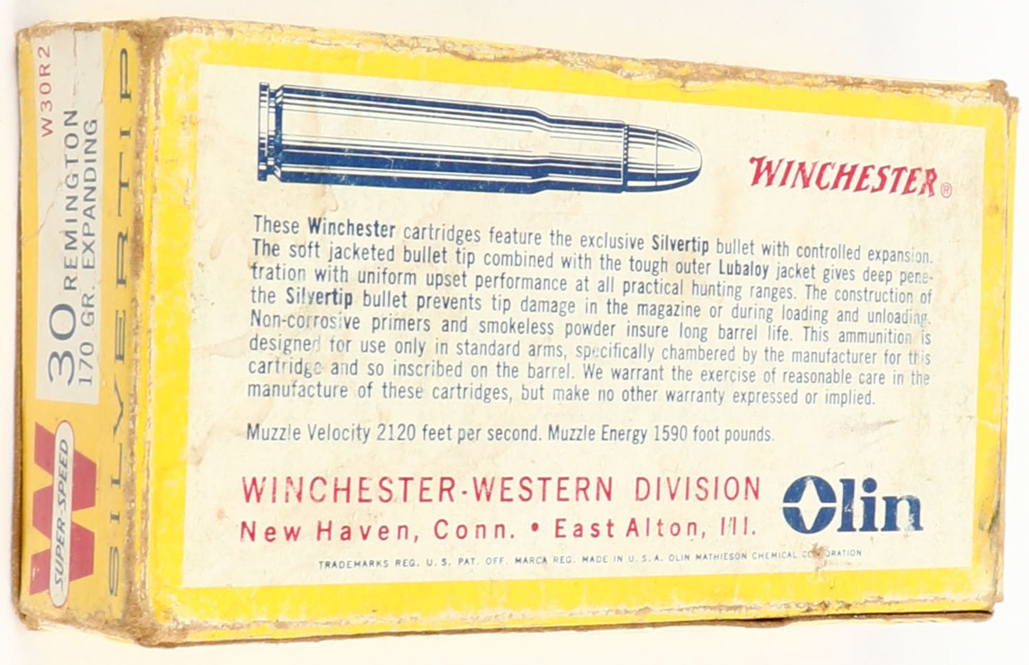 Winchester, Super-Speed Silvertip, .30 Remington, 170 Grain Expanding Bullet, Full, 1pc. Yellow white & red box, box is solid with very good color, some age soiling, top has been written on, some edge & corner wear, end flaps are solid, ammo is excellent. Grade: Very Good + - Value: 40 to 120
