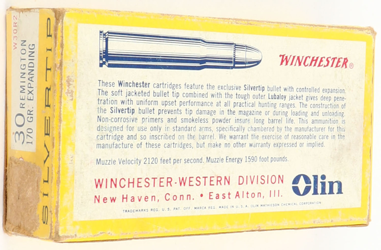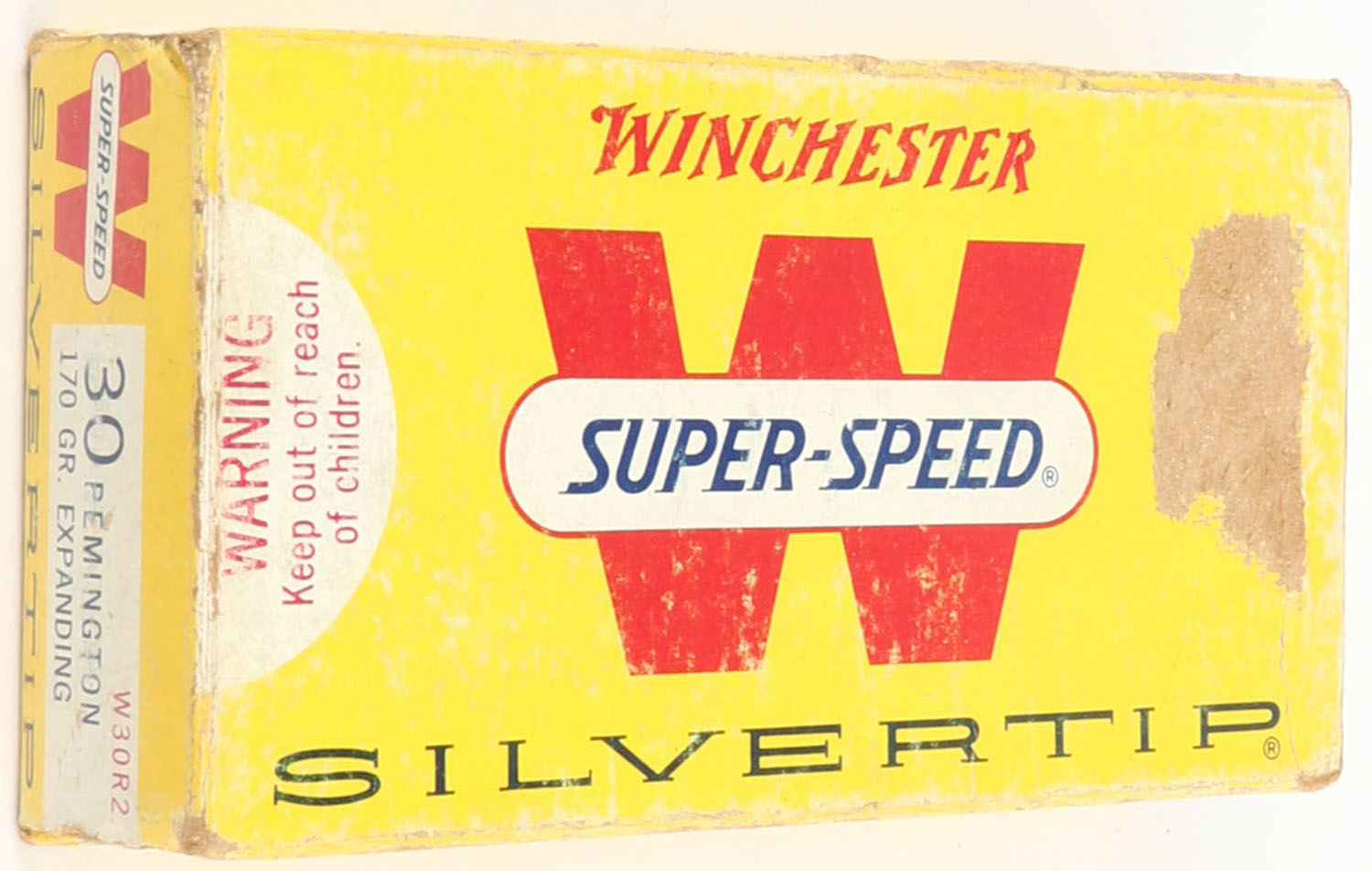Winchester, Super-Speed Silvertip, .30 Remington, 170 Grain Expanding Bullet, Full, 1pc. Yellow white & red box, box is solid with very good to excellent color, scuff on top, some shelf & corner wear, minor edge wear, end flaps are solid, ammo is excellent. Grade: Very Good ++ - Value: 40 to 120