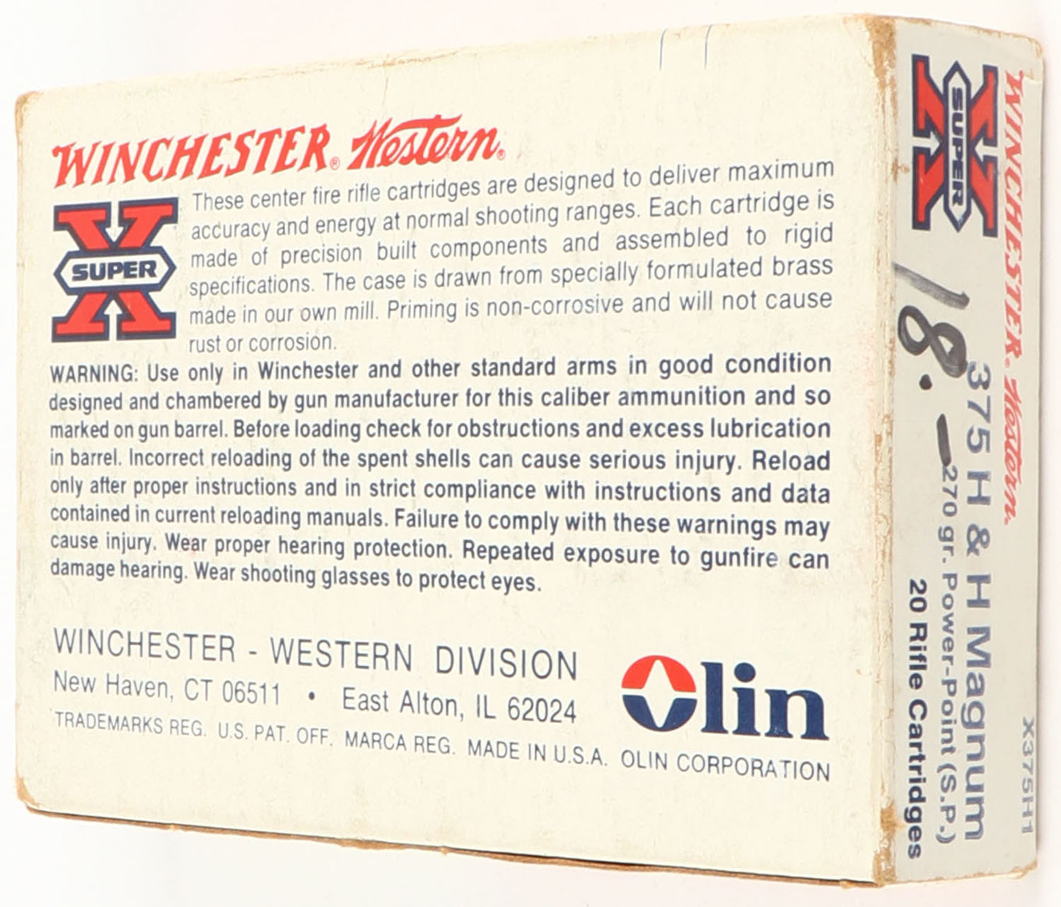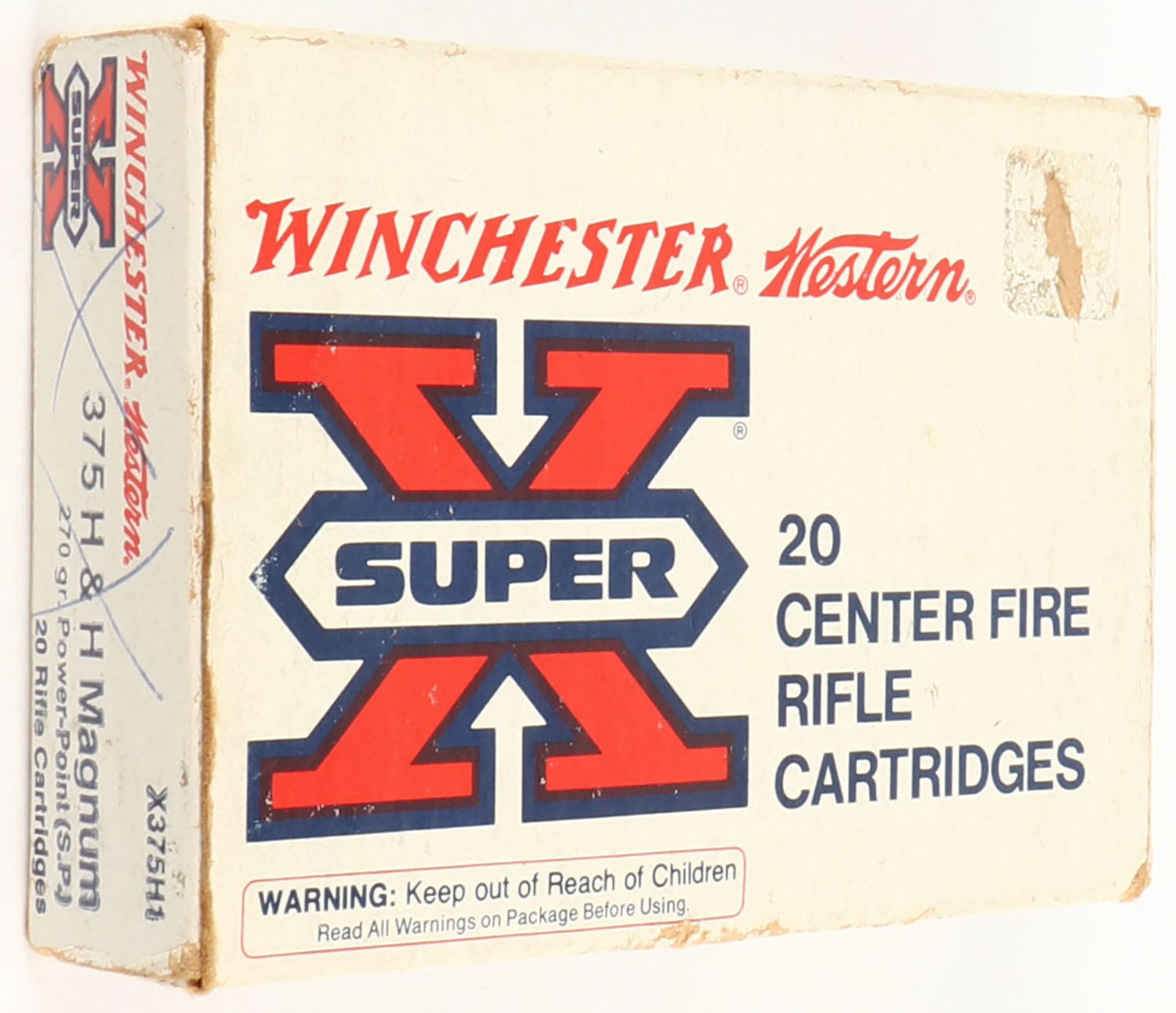 Winchester-Western, Super-X, .375 H&H Magnum, 270 Grain Power-Point, Partial 15rds., 1pc. White red & blue box, box is solid with very good to excellent color, minor age soiling, some edge & corner wear, end flaps are solid, ammo is excellent. Grade: Excellent - Value: 16 to 60