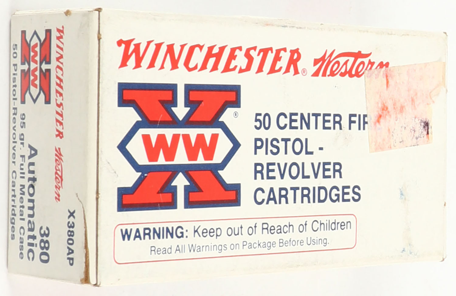 Winchester-Western, Super X, 380 Automatic, 90 Grain Full Metal Case, Full box, 1pc. White red & black box, box is solid with excellent color, very minor shelf marks, edges are crisp, end flaps are solid, Original price sticker residue on box, ammo is excellent. Grade: Excellent - Value: 10 to 40
