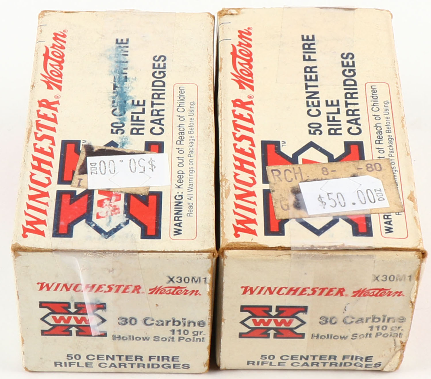 Winchester-Western, Lot of (2), X, .30 Carbine, 110 Grain Hollow Point, (1) box full, (1) box partial 24rds., 1pc. White boxes, boxes are solid with very good color, age soiling, some edge & corner wear, ammo is very good to excellent. Grade: Very Good + - Value: 2 to 60
