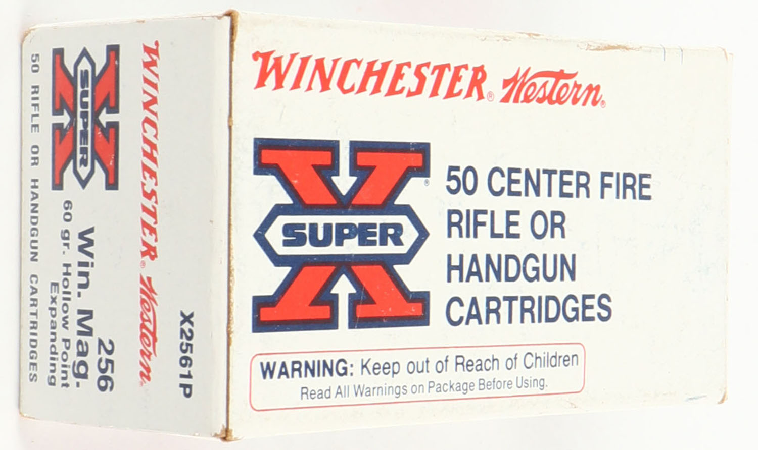 Winchester-Western, Super-X, .256 Win. Mag., 60 Grain Hollow Point Expanding, Full, 1pc. White & red box, box is solid with excellent color, very minor shelf & corner wear, edges are crisp, end flaps are solid, ammo is excellent. Grade: Excellent - Value: 50 to 150