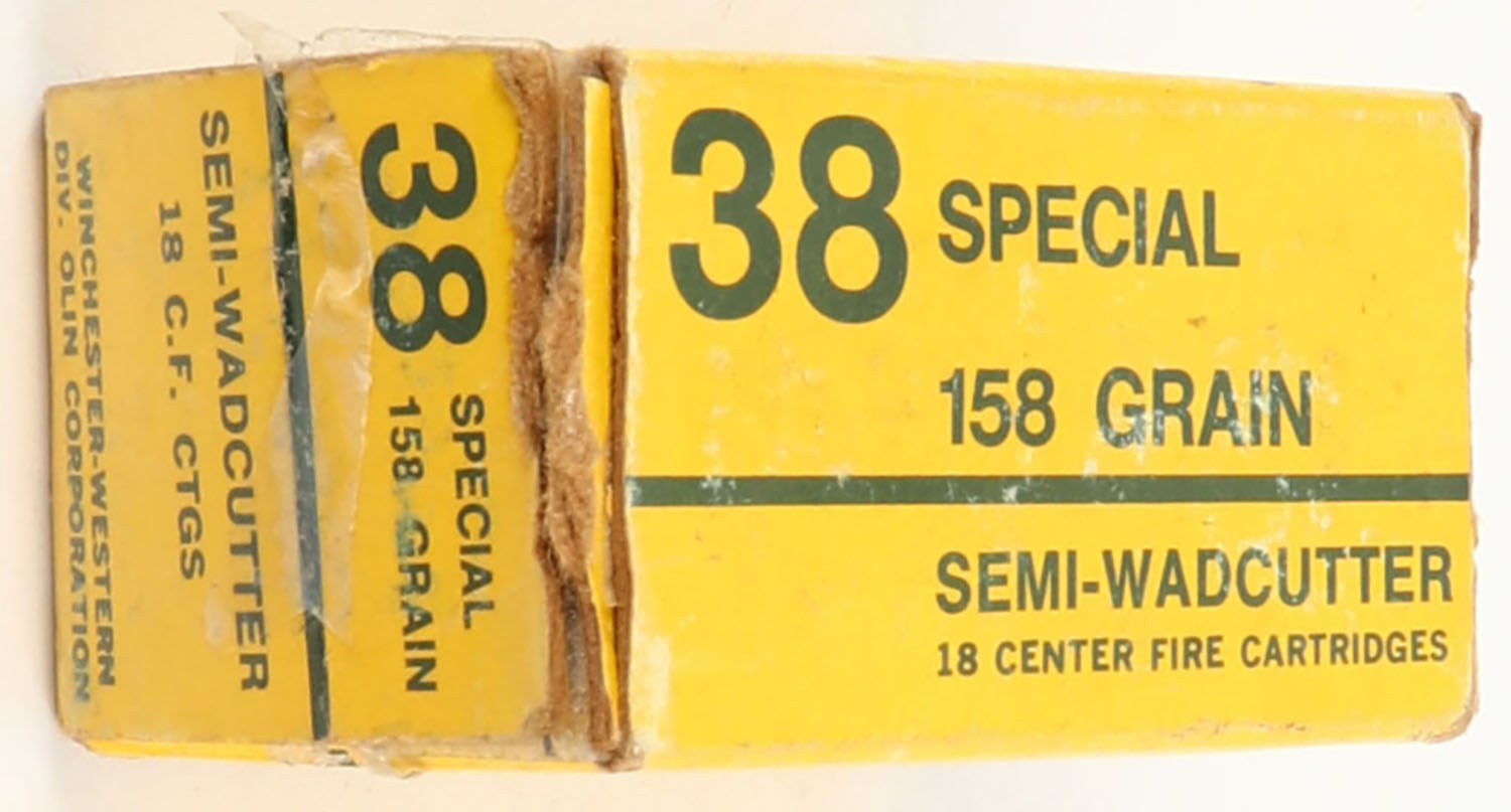 Winchester-Western, .38 Special, 158 Grain Semi-Wadcutter, Full, 18rds., 1pc. Yellow box with green printing, box is solid with excellent color, minor shelf & edge wear, some corner wear, end flaps are solid, ammo is excellent. Grade: Very Good ++ - Value: 8 to 40
