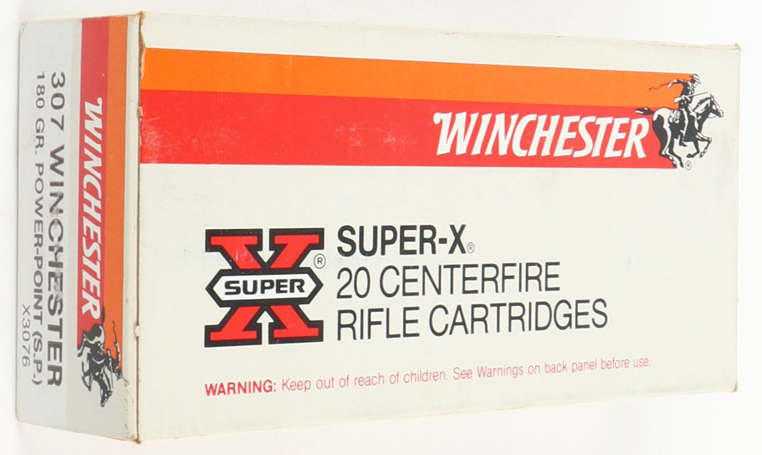 Winchester, Super-X, .307 Winchester, 180 Gr. Power-Point, Full, 1pc. Gray white & orange box, box is solid with excellent color, very minor shelf wear, minor corner wear, edges are crisp, end flaps are solid, ammo is excellent. Grade: Excellent - Value: 30 to 90