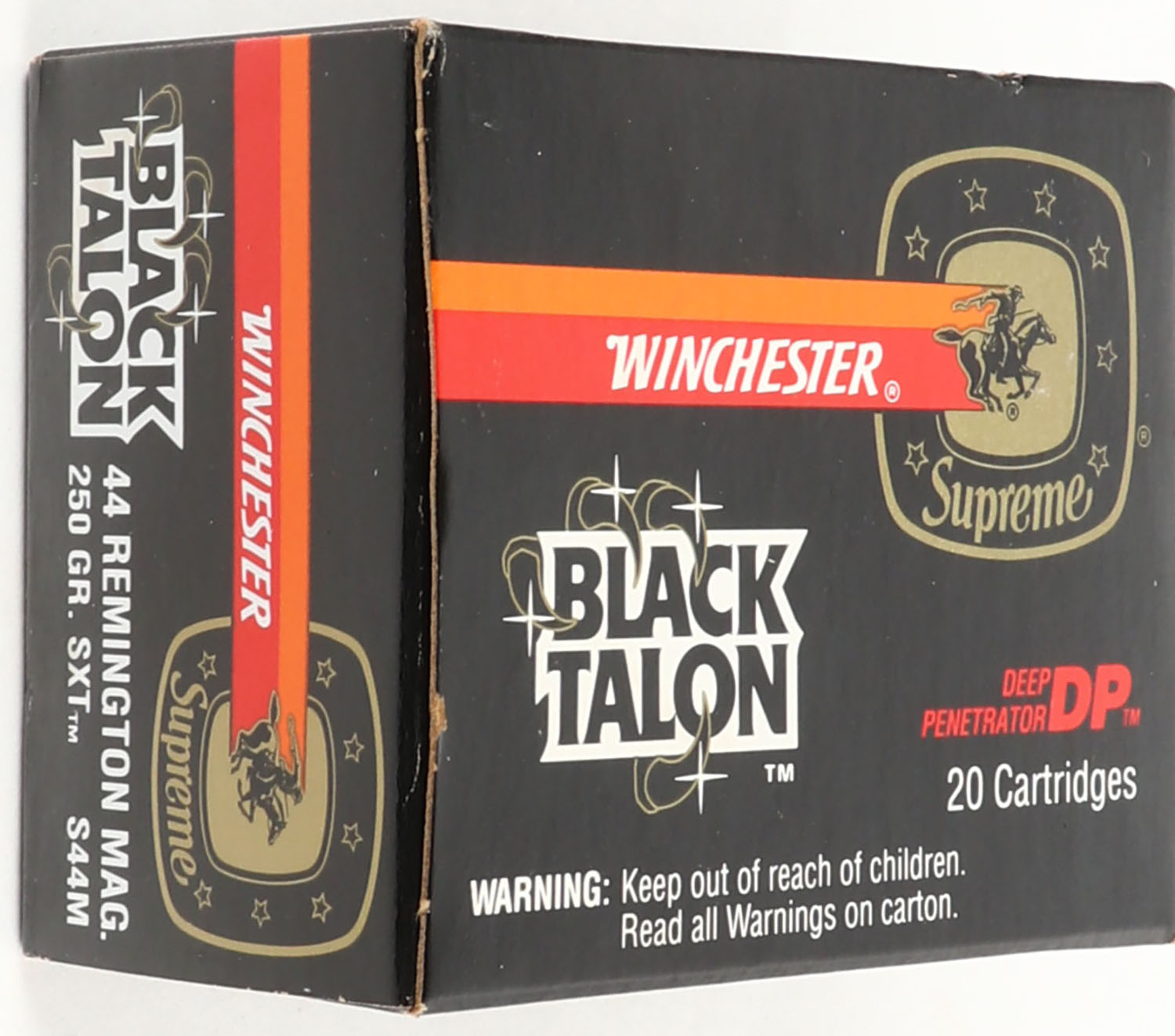 Winchester, Black Talon, .44 Remington Magnum, 250 Gr. SXT, Full, 1pc. Black red & orange box, box is MINT with minty color, corners are sharp, edges are crisp, end flaps are solid, ammo is minty. Grade: MINT - Value: 30 to 90